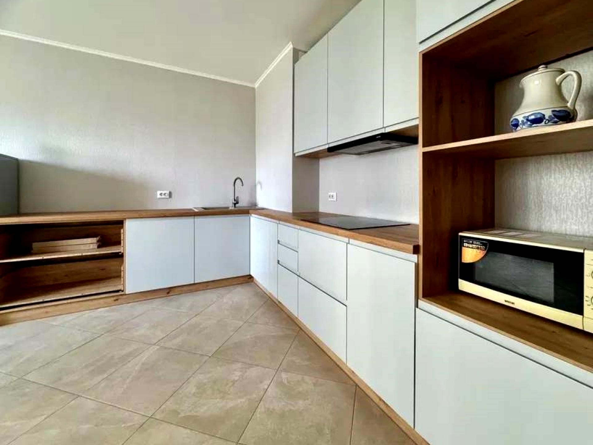 Велика кутова кухня з новими меблями та технікою. Окрема затишна вітальня з диваном і шафою-купе.