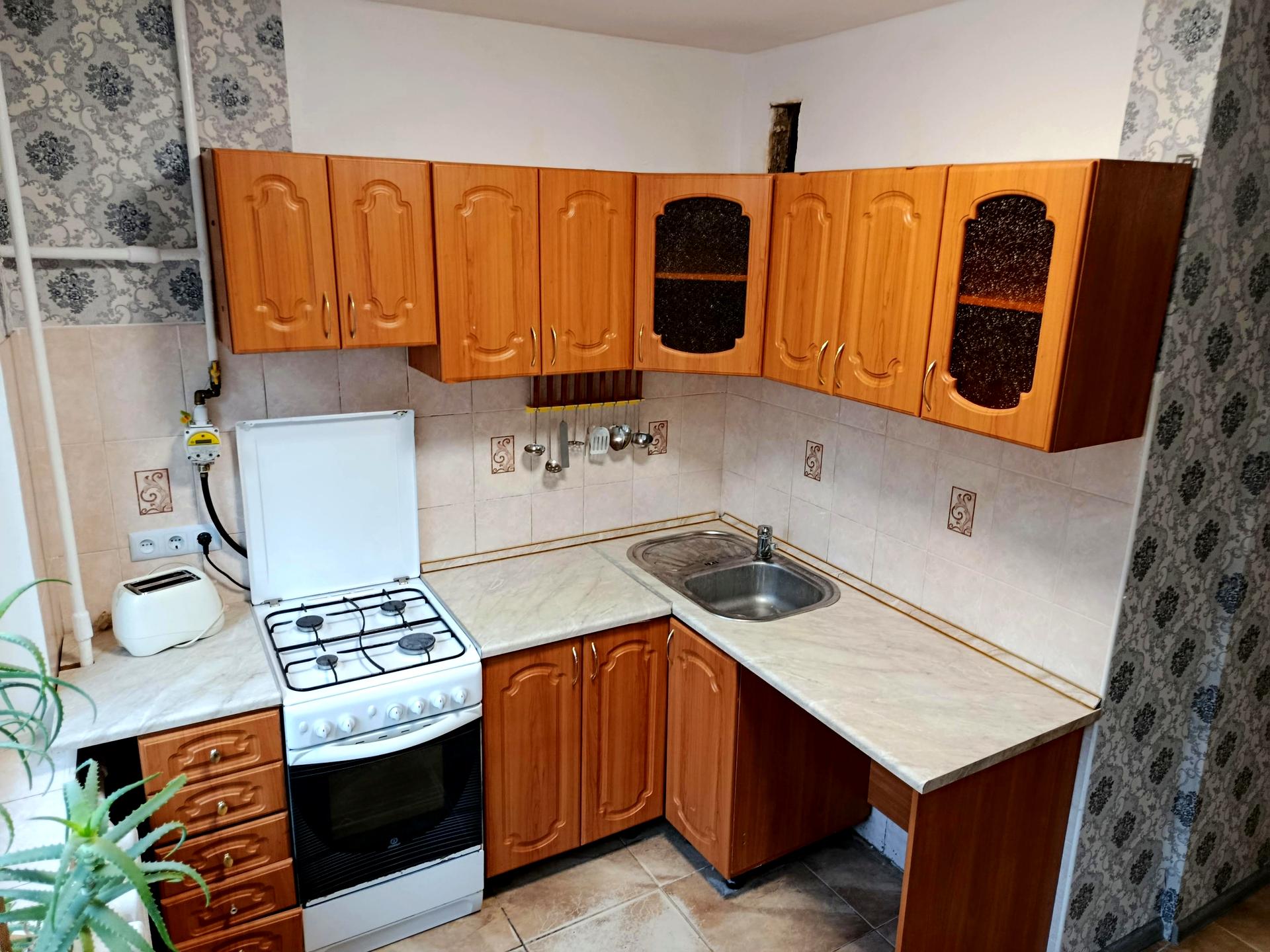 Вбудована кухня, газова плита, двокамерний холодильник, стіл, стільці