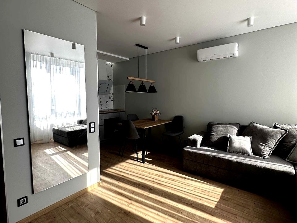 В кухні-вітальні розташований великий зручний диван, телевізор + apple tv, кондиціонер