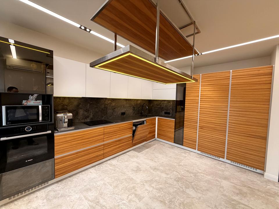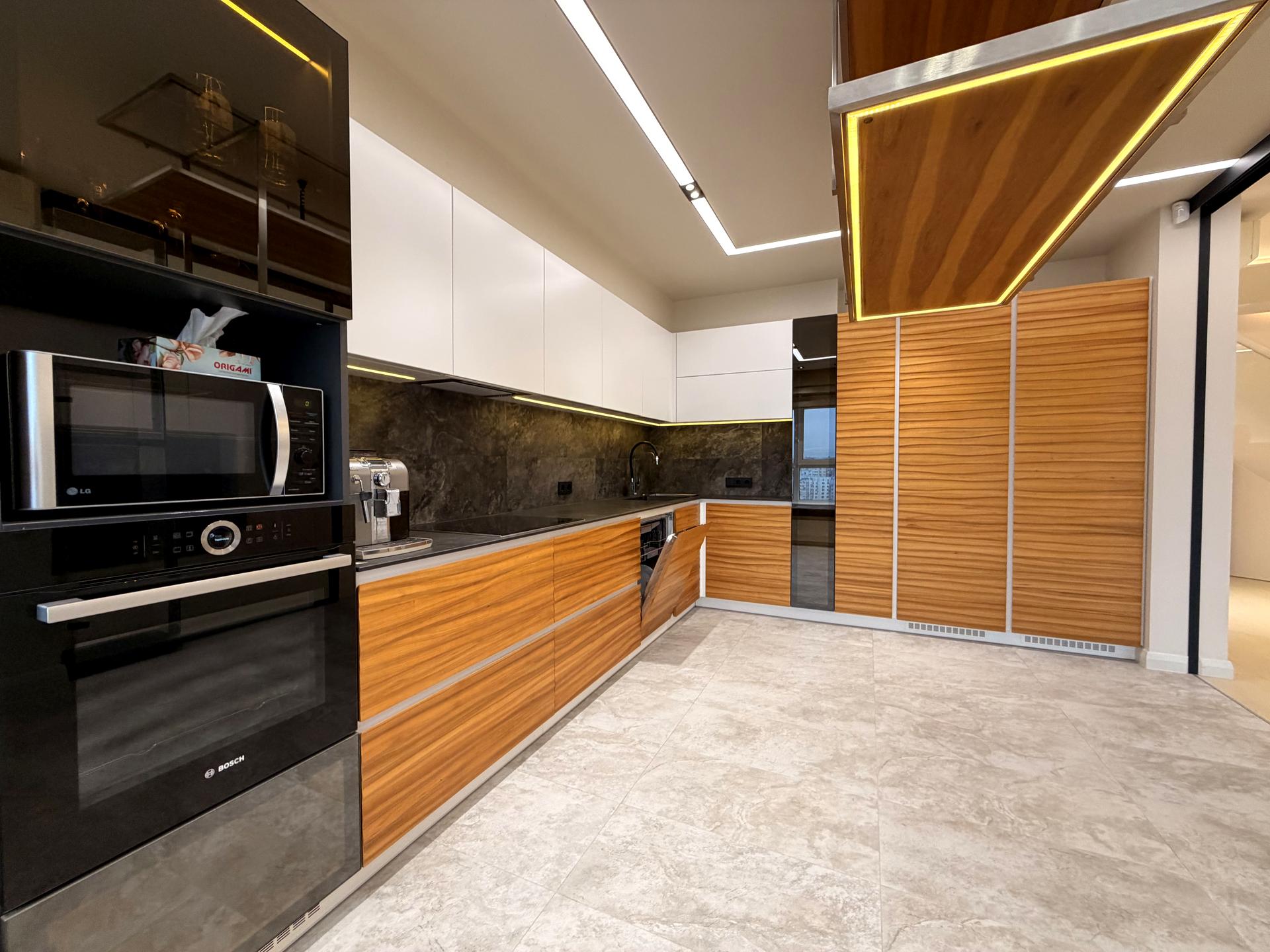 • Кухня повністю укомплектована: вбудована техніка, духова шафа, посудомийна машина, великий холодильник із морозильною камерою, сміттєпереробник.