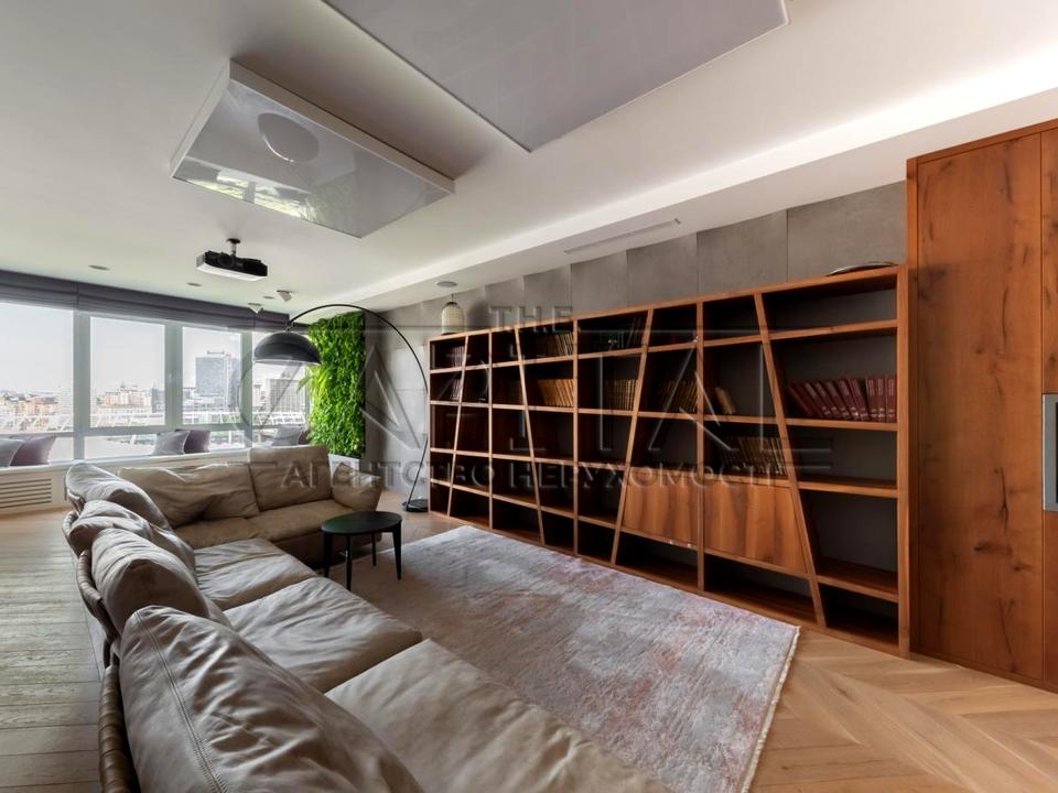 У вітальні замість телевізора встановлено проектор для домашнього кінотеатру, що створює справжню атмосферу затишного перегляду. Серед переваг — тепла підлога, система вентиляції, біокамін, сигналізація та відеоспостереження. Для поціновувачів — програвач для вінілів. Панорамні вікна відкривають краєвид на центр столиці та НСК «Олімпійський».