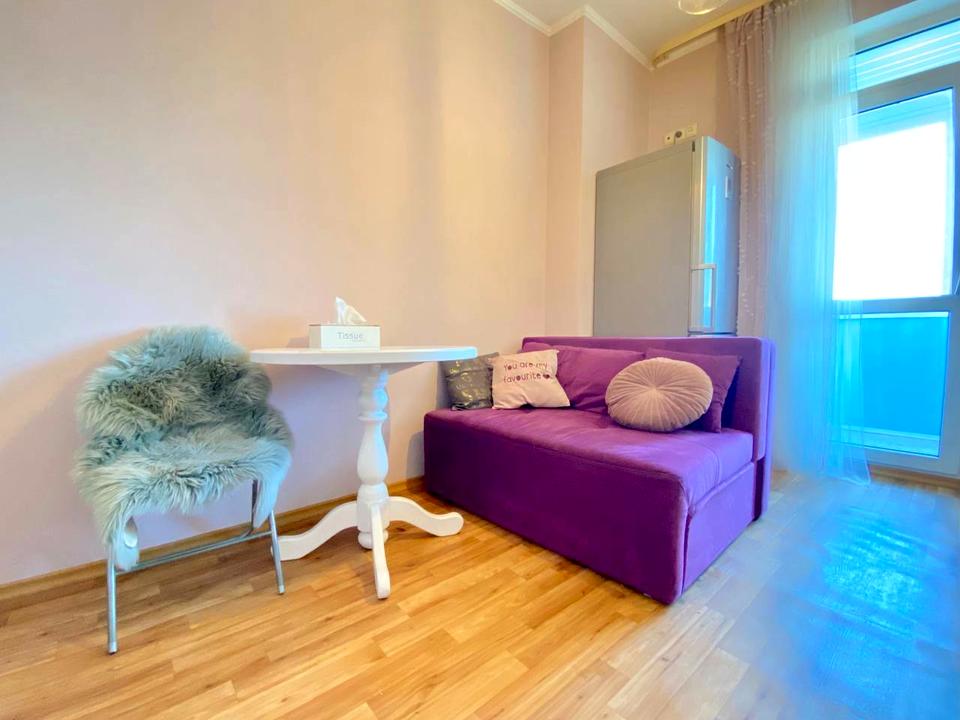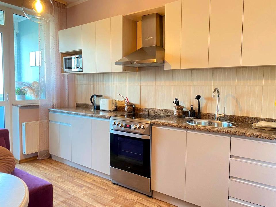 В квартирі 1 кімната, Технологія будівництва - Монолітно-каркасна. Планування кімнат Кухня-вітальня. В квартирі є Телевізор, Кабельне ТБ, Праска, Шафа, Ліжко, Пральна машина, Холодильник, Мікрохвильовка, Посудомийна машина, Посуд. Загальний стан квартири - З ремонтом. Без комісії
