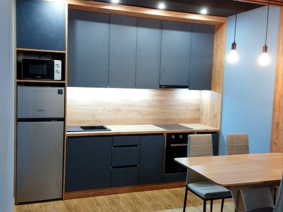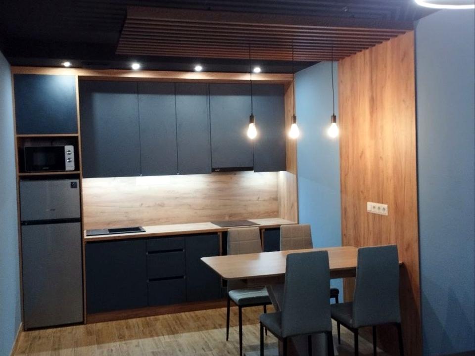 • Кухня-студія з якісними меблями, повністю укомплектована технікою: холодильник, мікрохвильова піч, варильна поверхня, витяжка.