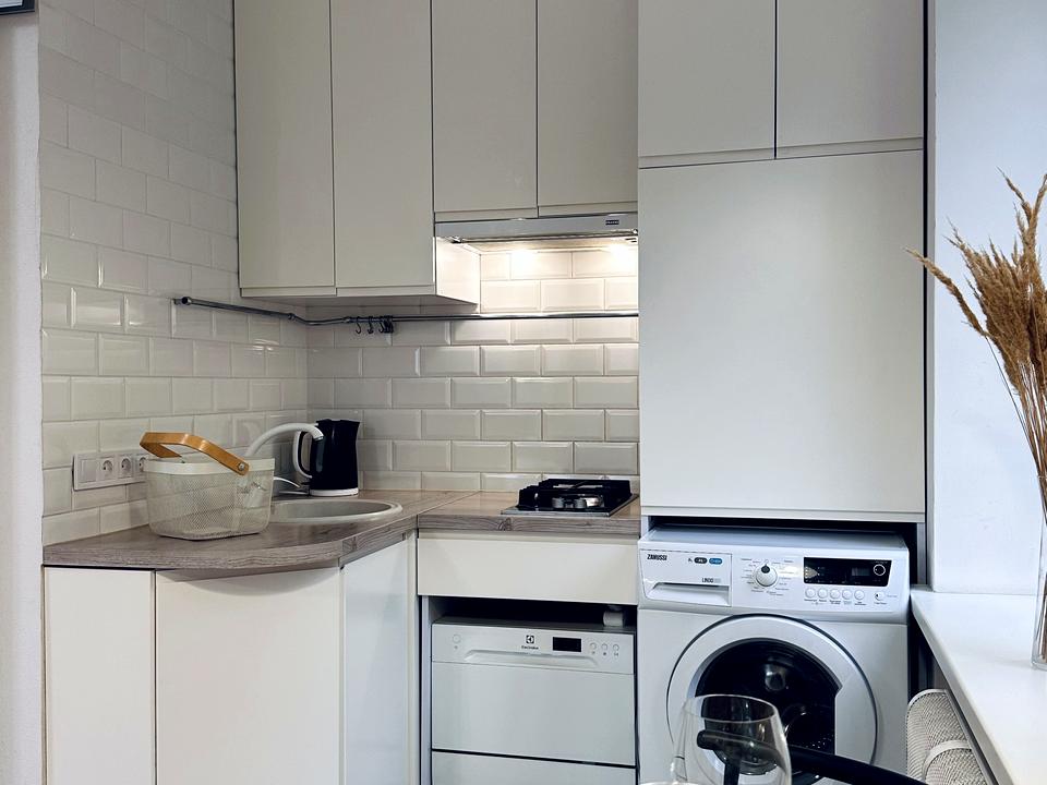 * зона КУХНИ - встроенная кухонная мебель + ПОСУДОМОЕЧНАЯ машина; мощная вытяжка, холодильник