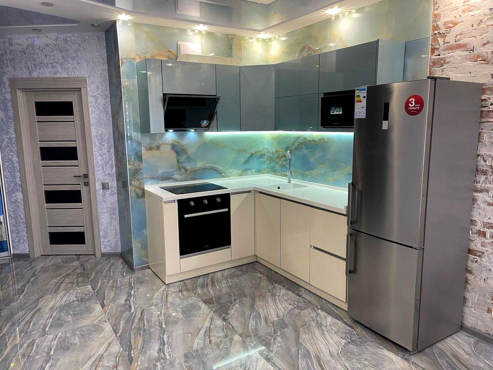 Кухня: вбудована, плита, духовка, витяжка, двокамерний холодильник, СВЧ, обідній стіл, стільці.