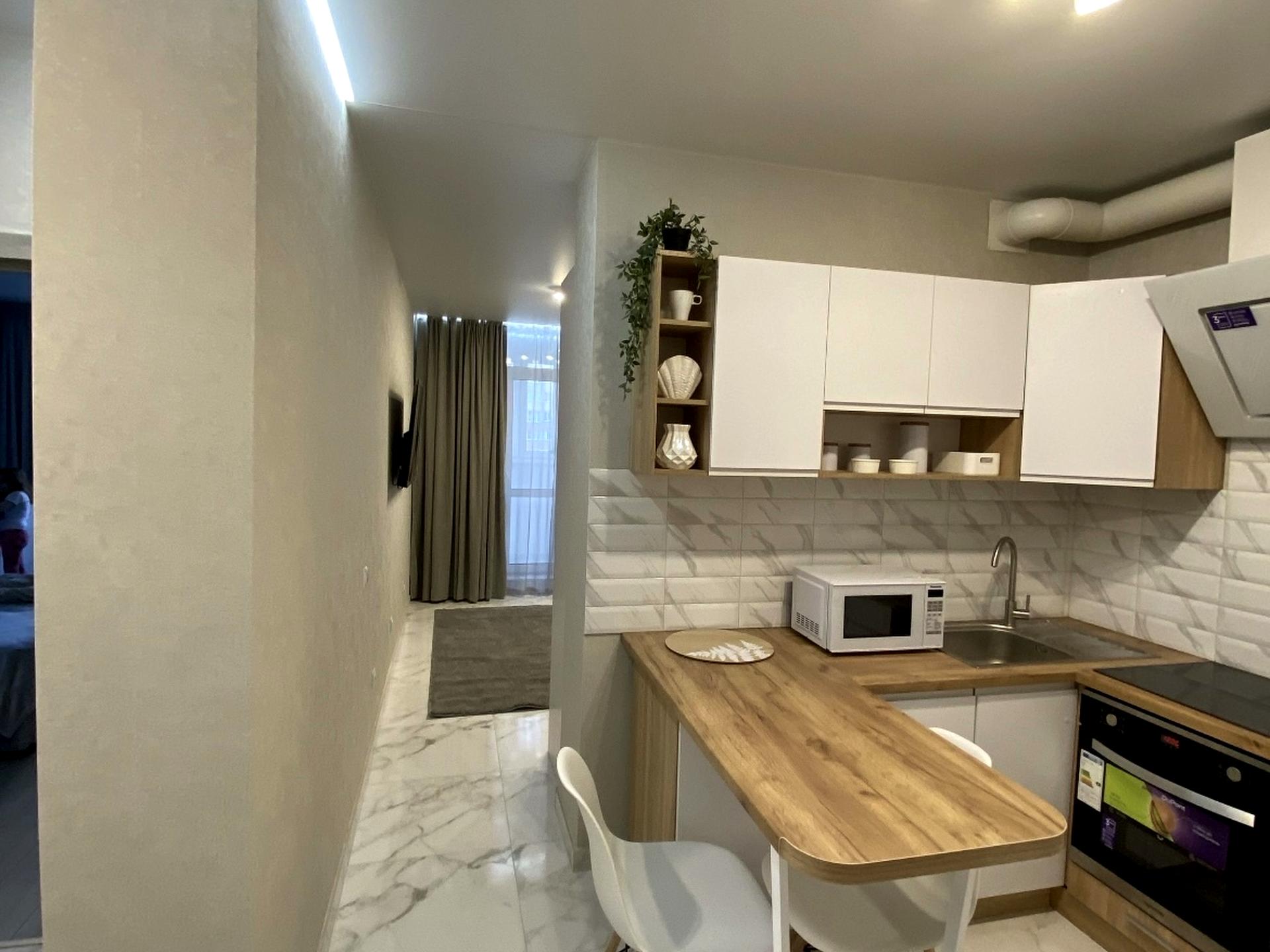 У квартирі встановлені два інверторні кондиціонери ,є бойлер ,повноцінна ванна (не душ кабіна ),духовка ,мікрохвильова піч ,витяжка, холодильник,телевізор,стіл для роботи або навчання ,комфортне ліжко с ортопедичним матрацом , шафи для одягу ,розкладний диван та інше .Все якісне -зроблене для себе .