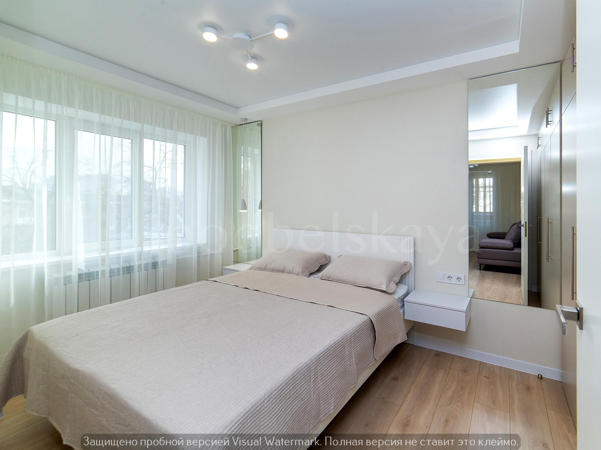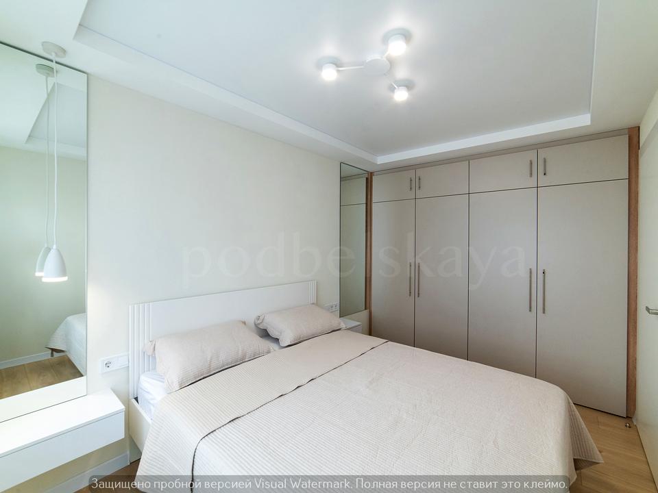 Спальня – затишна, з великим ліжком, ортопедичним матрацом, приліжковими тумбами та вбудованою шафою.