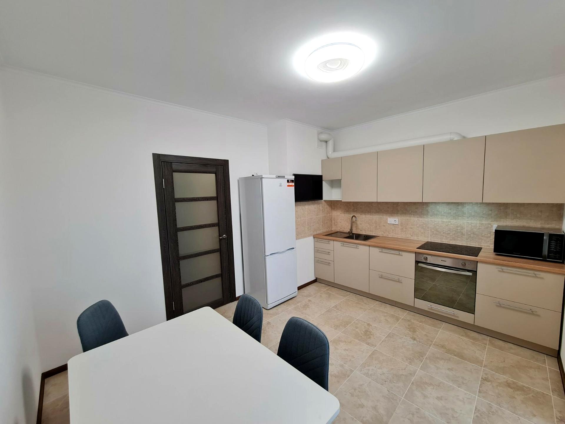 Холодильник 🧊, електрична плита з духовкою 🍳, мікрохвильова піч, мийка 🧼, кухонні шафи з робочою поверхнею, два стільці, плиткова підлога, кондиціонер ❄️.