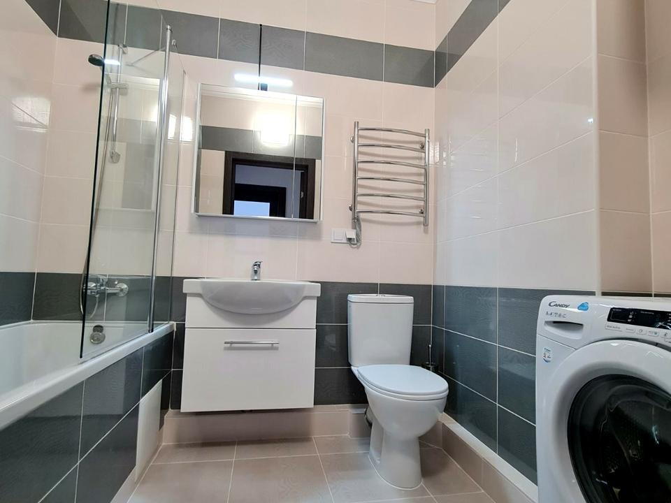 Ванна з душем 🛁, умивальник з тумбою, унітаз 🚽, пральна машина 🧺, дзеркало з підсвіткою, сушарка для рушників, плиткова підлога.