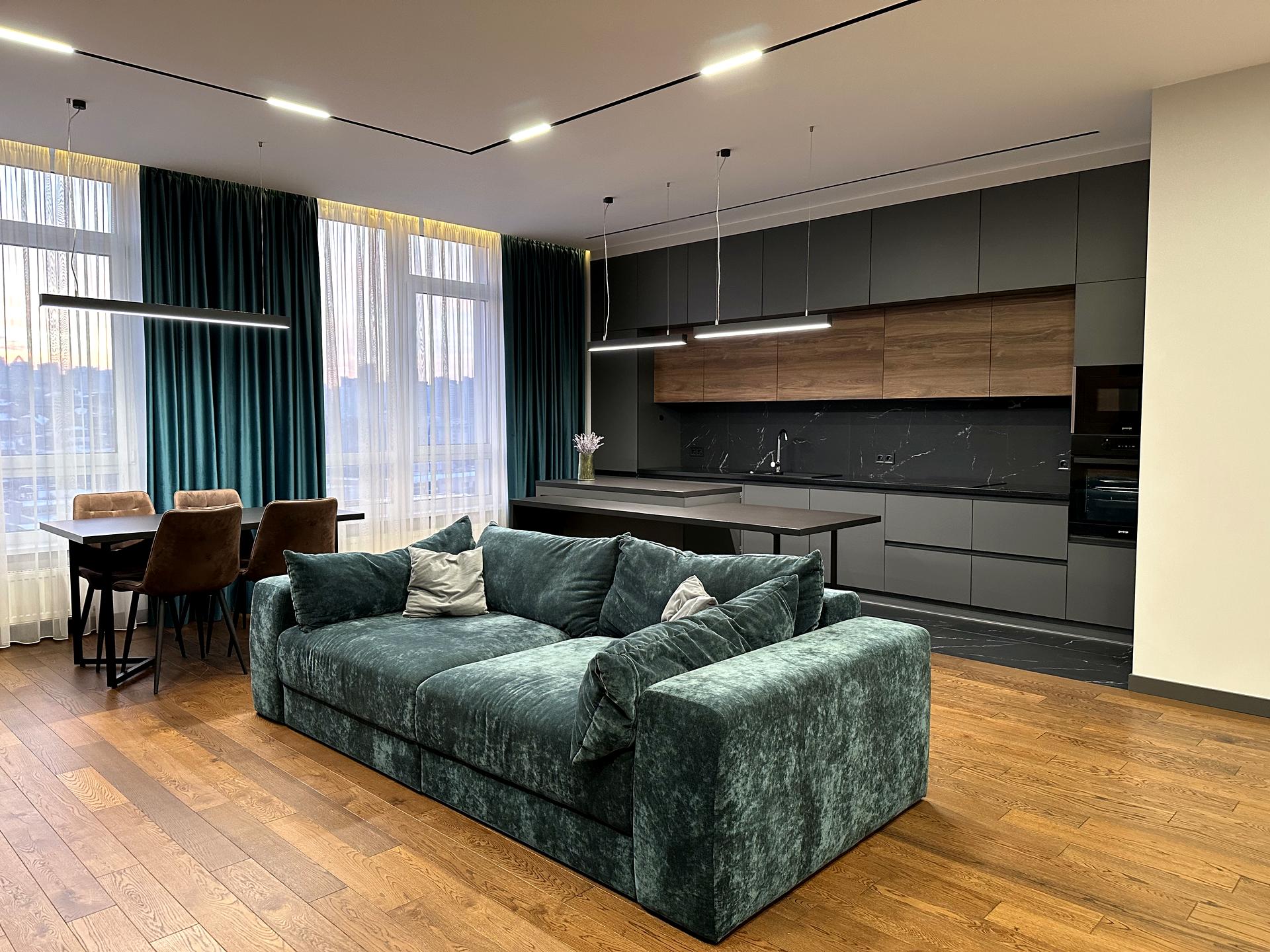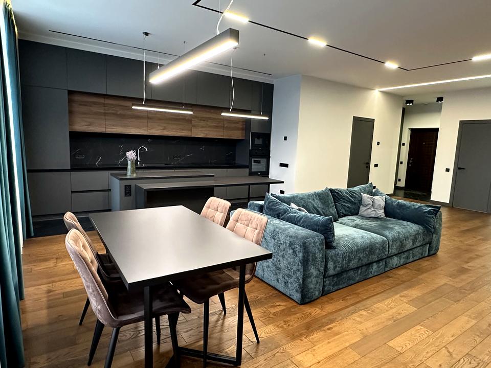 Сама квартира дуже простора: має загальну площу - 115м2, дві окремі спальні, велику кухню-вітальню, 2 незалежних санвузли (душова/ванна) та пральню. Висота стелі – 3м. Укомплектована всім необхідним для вашого комфортного проживання. З панорамних вікон відкривається красивий вид на Київ, де можна за чашкою кави зустрічати світанки та насолоджуватись красивими заходами сонця.