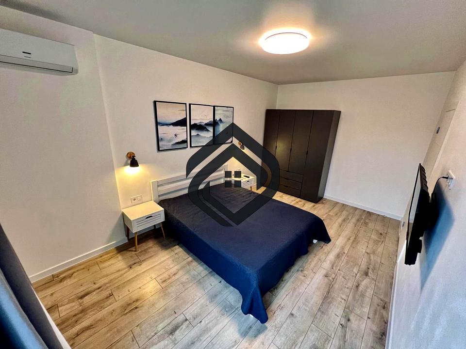 Двоспальне ліжко, приліжкові тумби, шафа велика та простора, кондиціонер, смарт ТВ, картини, на підлозі ламінат.