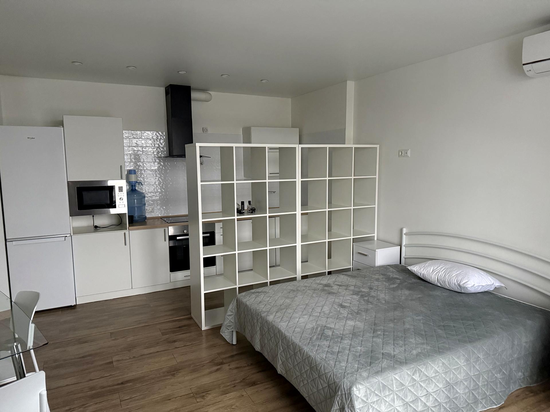 В квартирі 1 кімната. Планування кімнат Студія. В квартирі є Праска, Ліжко, Кондиціонер, Пральна машина, Сушильна машина, Душова кабіна, Холодильник, Мікрохвильовка, Посудомийна машина. Будинок побудований в 2021 році. Загальний стан квартири - З ремонтом. Працює без світла - вода, опалення, інтернет, ліфт