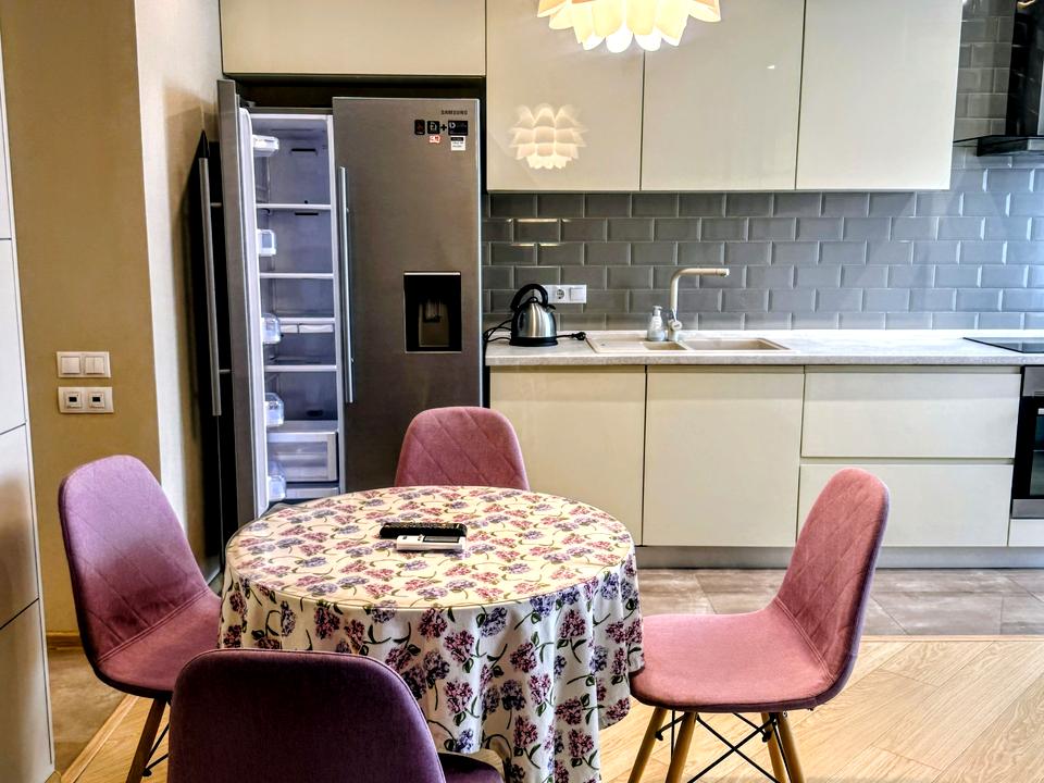 КУХНЯ-СТУДІЯ: повний комплект вбудованої побутової техніки: індукційна поверхня, духовка з витяжкою та мийкою, великий двохдверний холодильник side by side. Стільниця містка, що дозволяє розмістити настільну побутову техніку: чайник, мікрохвильову піч, кавоварку та інше.