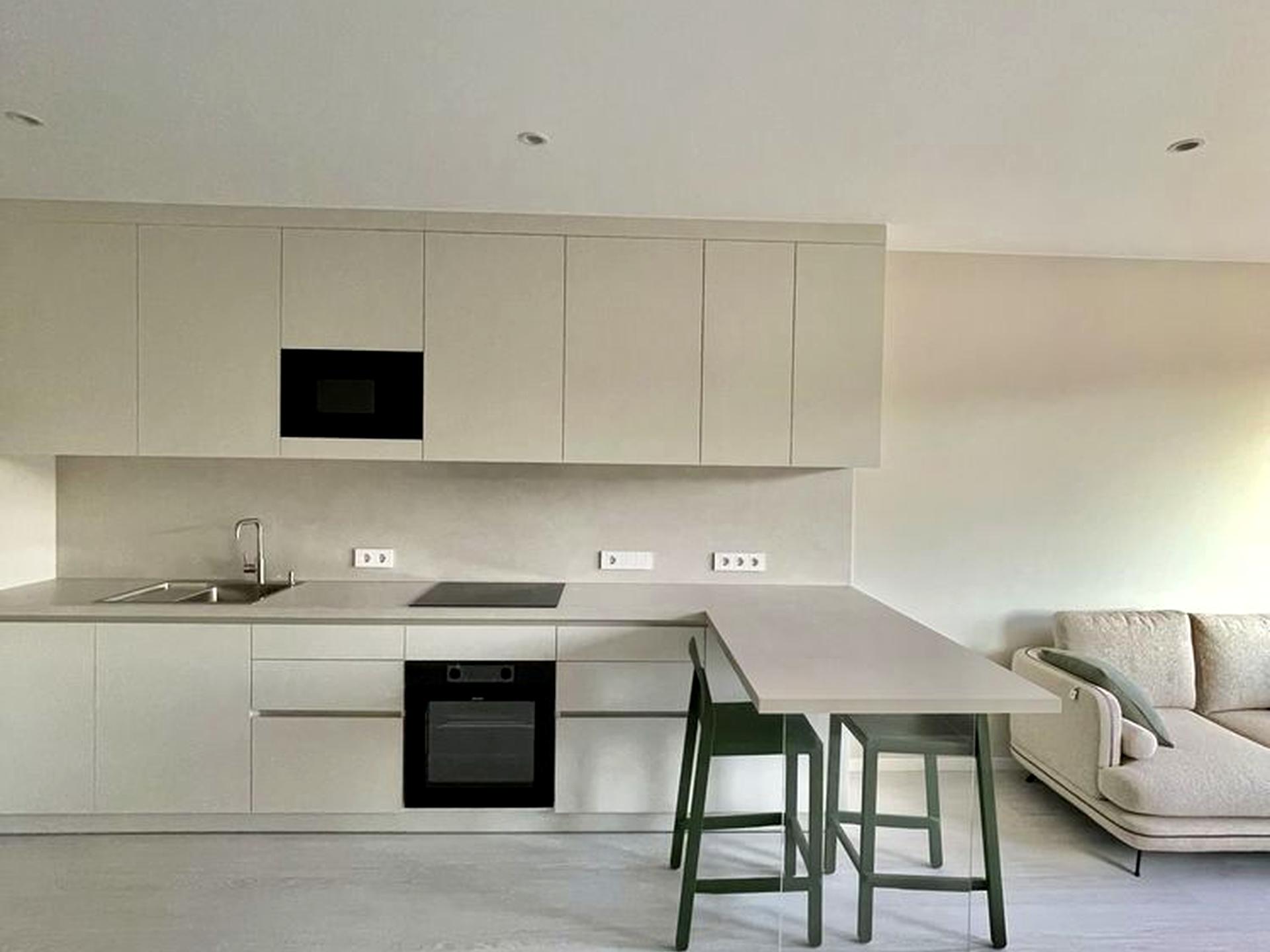 * Простора кухня-вітальня з диваном, великим Smart TV та робочим столом