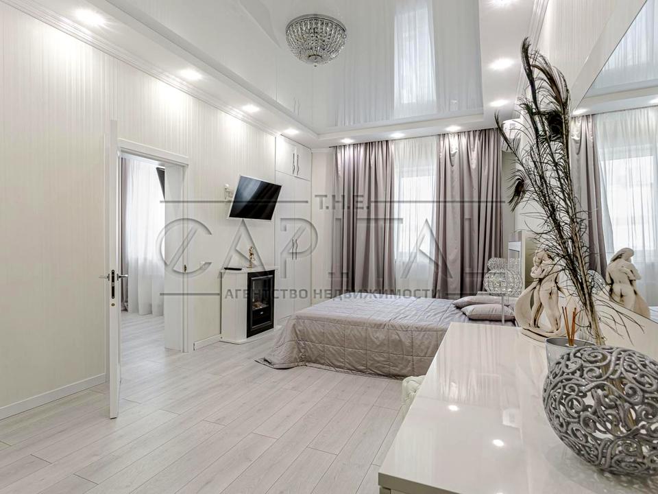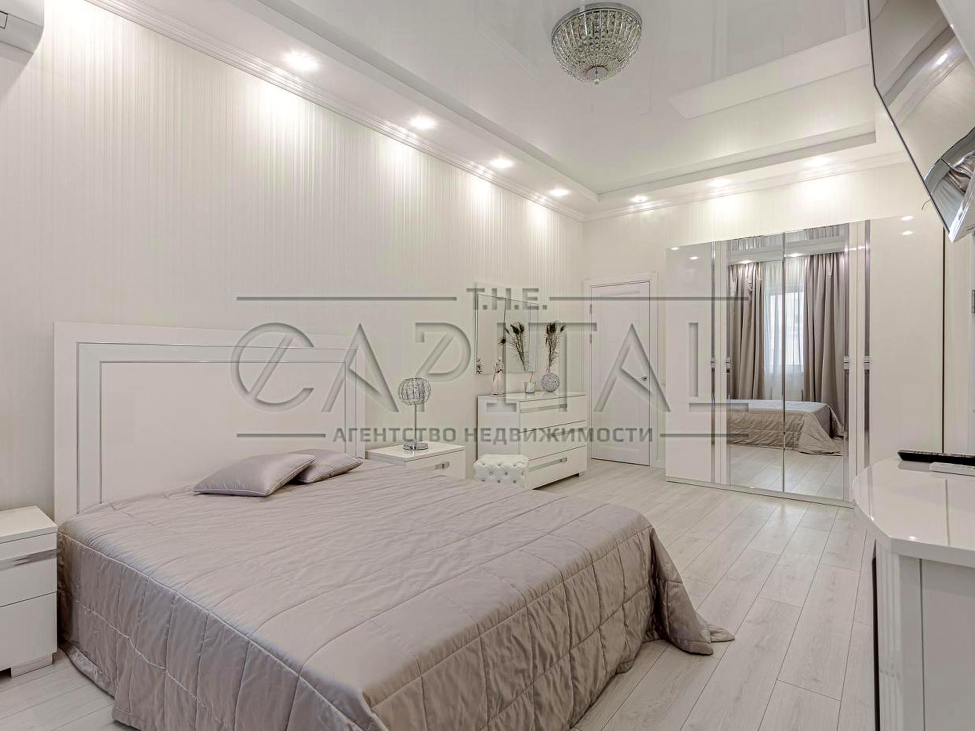 Спальня выполнена в тёплых тонах, белоснежная мебель - 2 вместительных шкафа, телевизор, кондиционер. Так же есть шкаф в холле и большая гардеробная. Ванная комната вмещает современную душевую кабину-джакузи, биде, бойлер, стиральную машину.