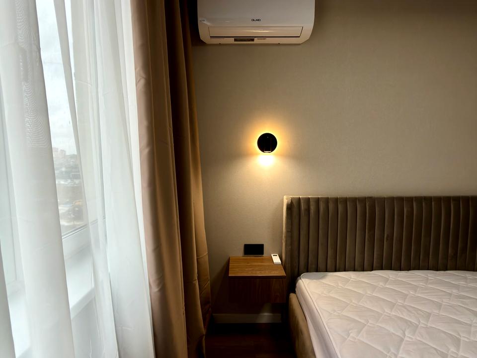 В спальні- велике двоспальне ліжко з ортопедичним матрацом та місткою нішею для зберігання речей, приліжкова тумба, простора шафа-купе, дамський столик, кондиціонер.