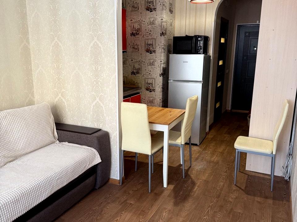 Двоспальний диван, стіл, шафа-купе для одягу, вбудована кухня.