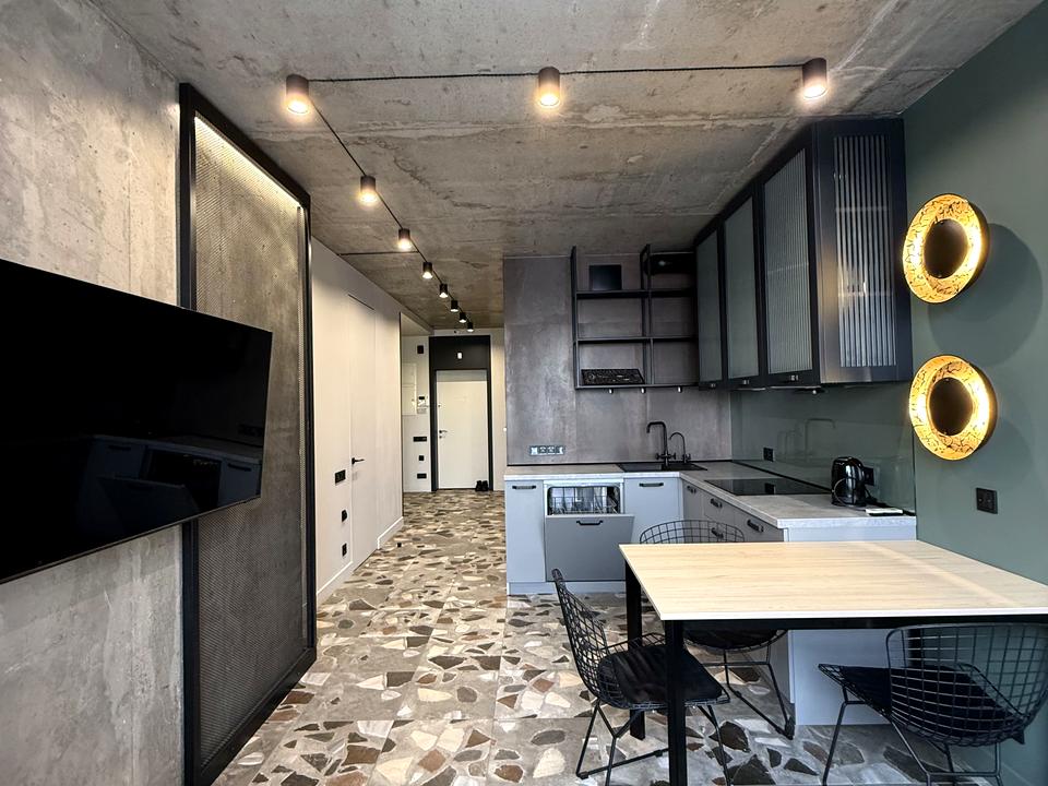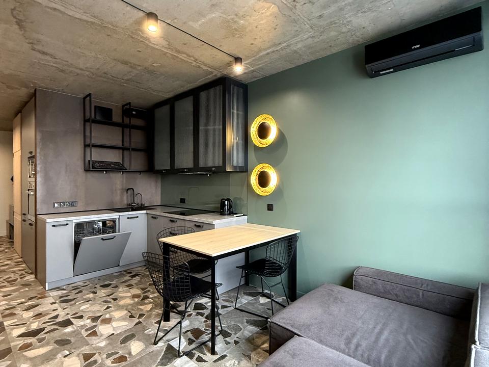 В квартирі 2 кімнати, висота стелі 3 метра, Технологія будівництва - Монолітно-каркасна, Тип будинку - Спец. проект. Планування кімнат Роздільне. Немає газу, кухонна плита електрична. Є балкон. У квартирі є Телевізор, Праска, Підігрів підлоги, Кондиціонер, Пральна машина, Душова кабіна, Холодильник, Мікрохвильовка, Посудомийна машина, Посуд. Будинок побудований в 2018 році. Загальний стан квартири - З ремонтом. Гаряча вода - електричний бойлер. Кількість санвузлів: 1. Інтернет оптоволоконний. Працює без світла - вода, опалення, інтернет, ліфт. Тип кухні - кухня-студія. Кількість спален: 1. Комісія за послуги 30 %