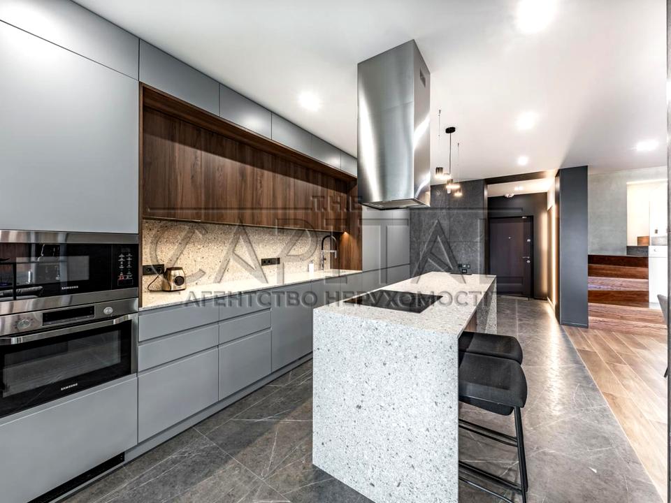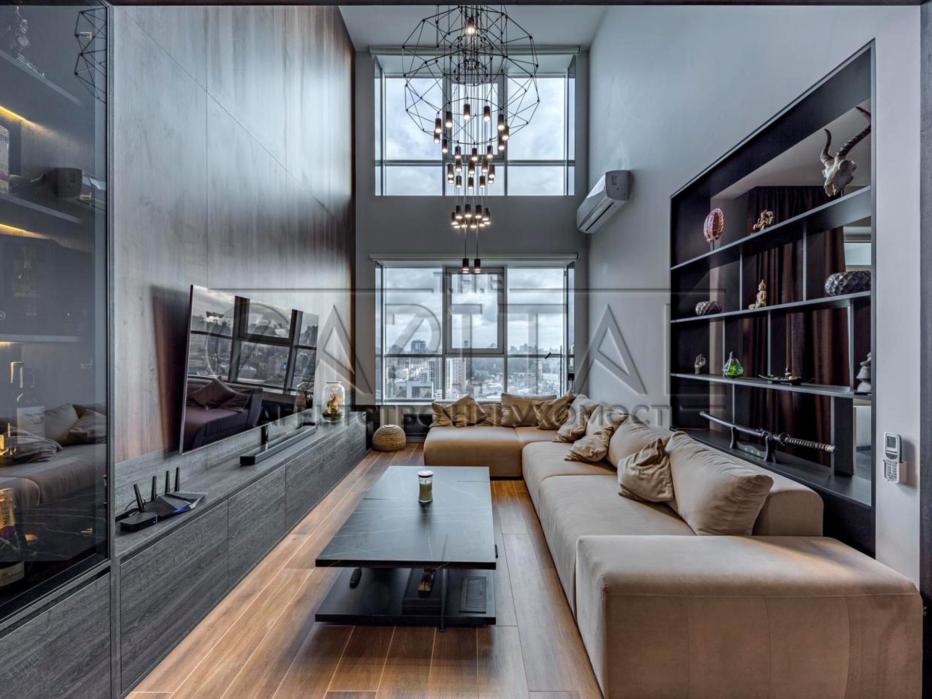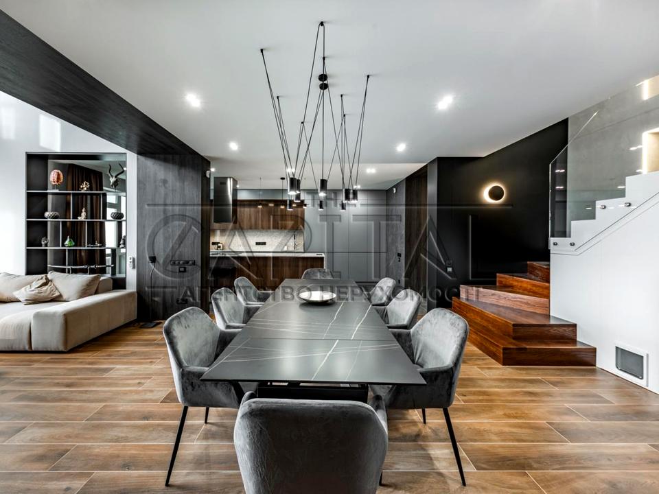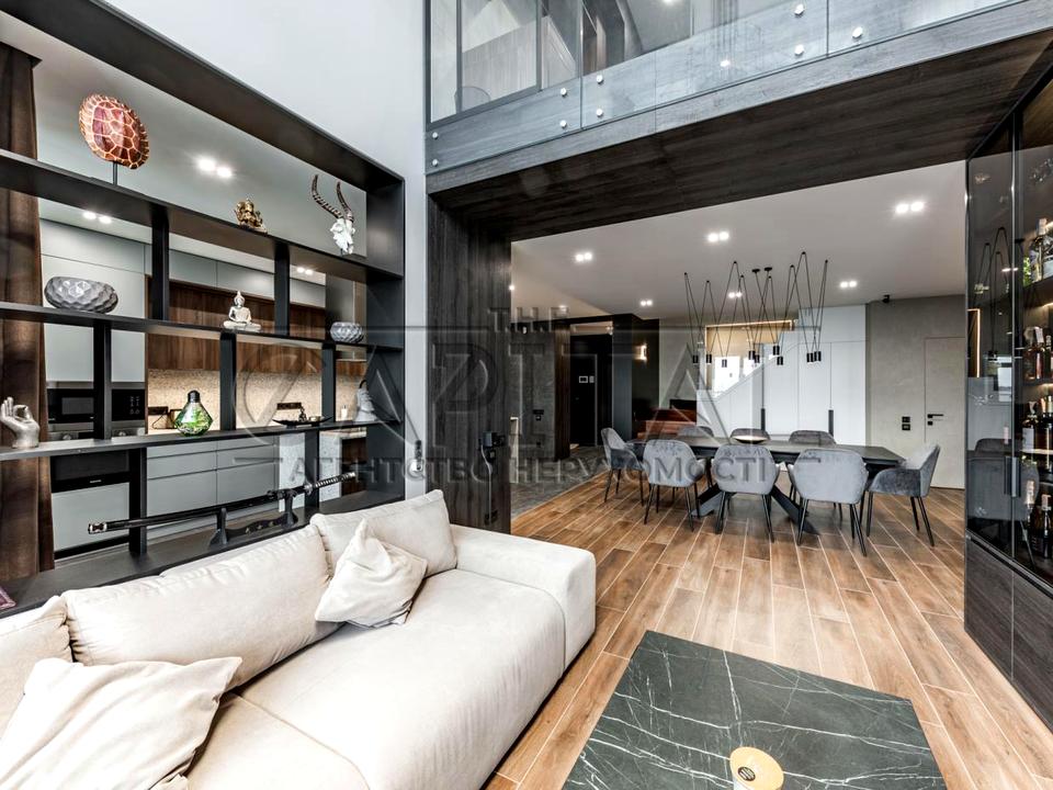 Сучасне — грамотне зонування квартири, дві спальні, кабінет, спортзал, незрівнянна обідня зона з висотою 6 метрів, підвісною люстрою і панорамним видом , дві гардеробні кімнати.