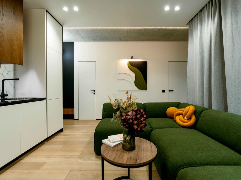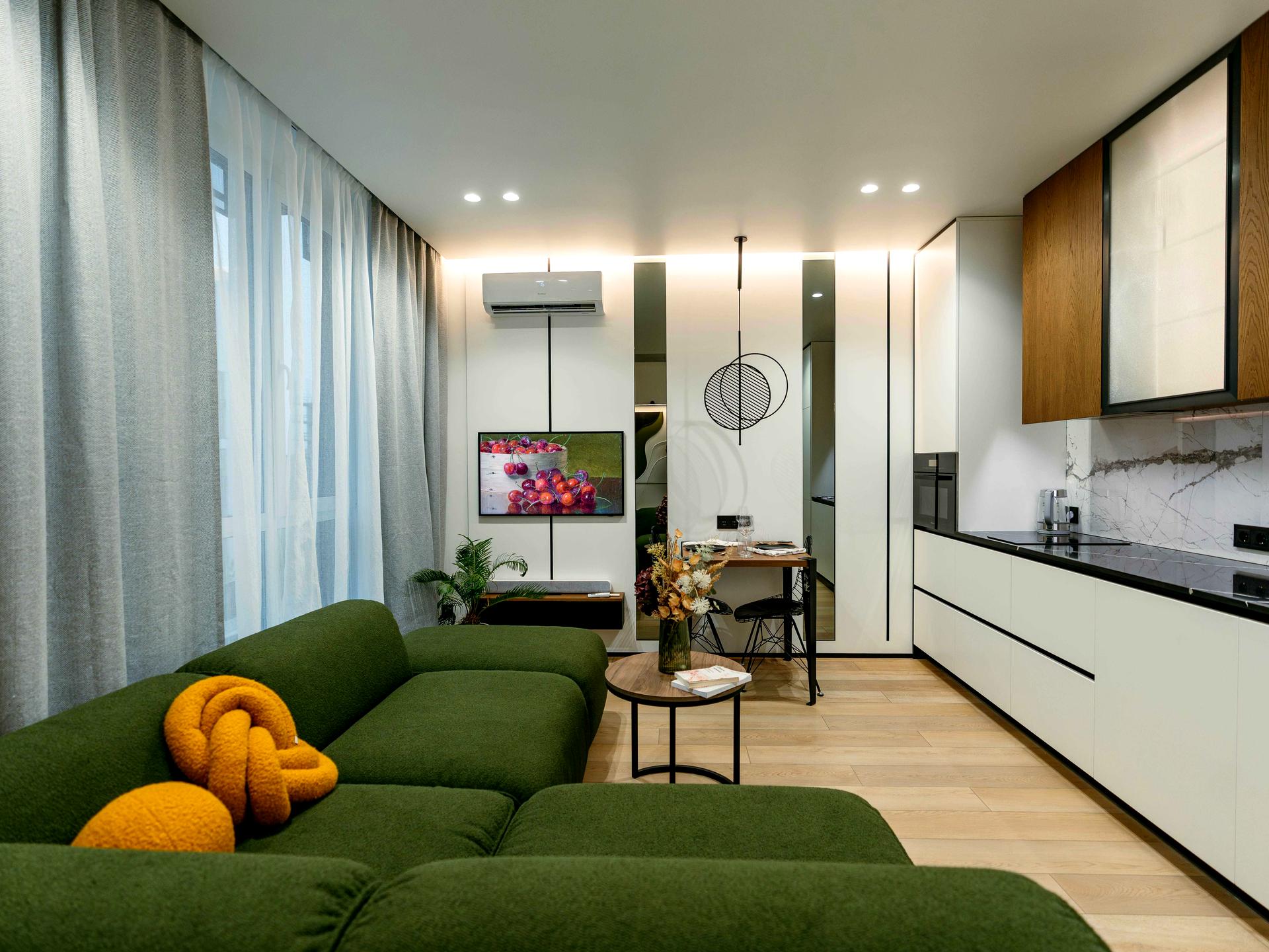 Квартира з сучасним ремонтом у мінімалістичному стилі. Простора кухня-вітальня з великим зеленим диваном, обідньою зоною та повністю укомплектованою кухнею: