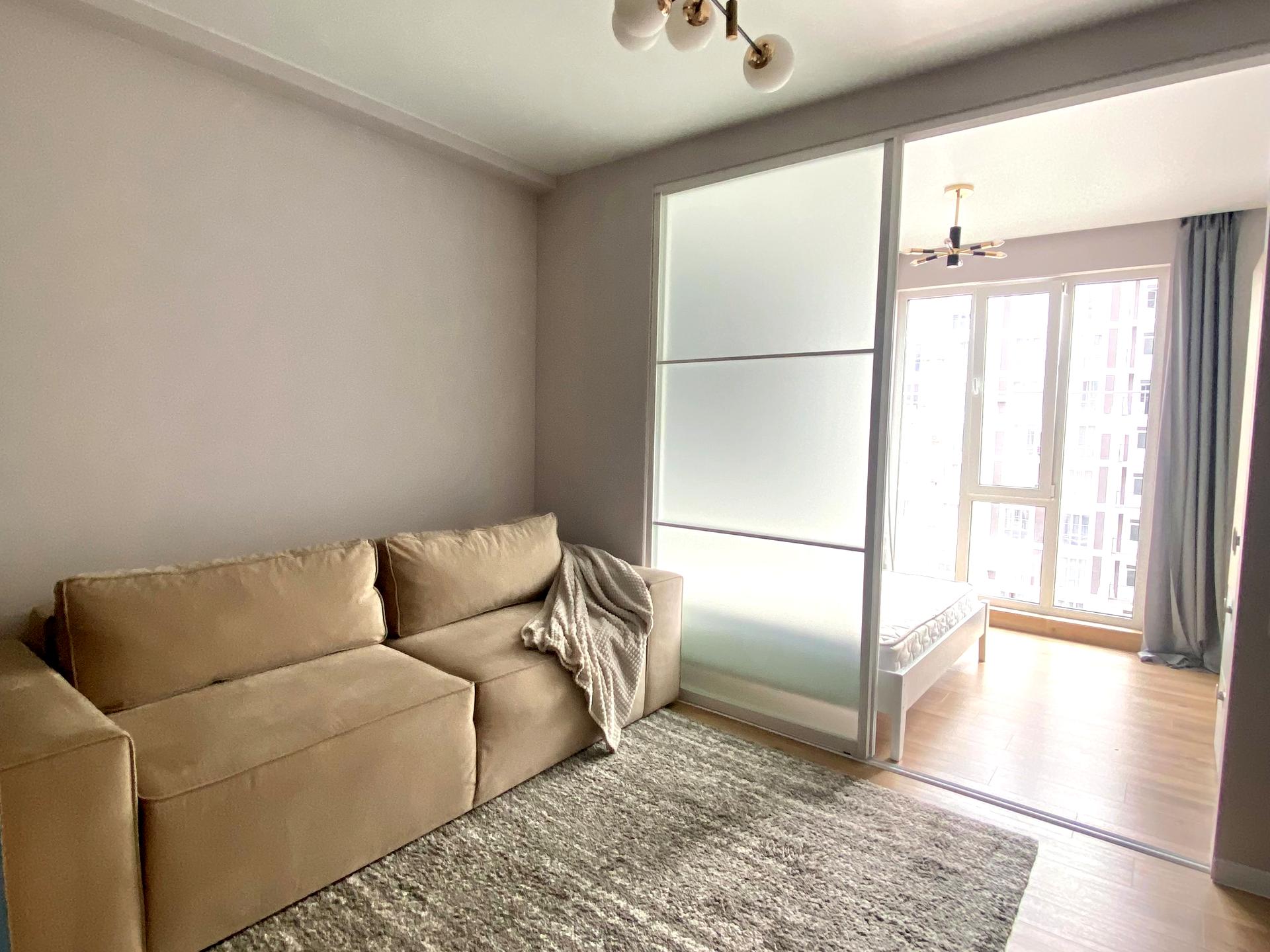 Планування: однокімнатна студія розділена розсувними дверима на спальню кімнату та кухню-вітальню.