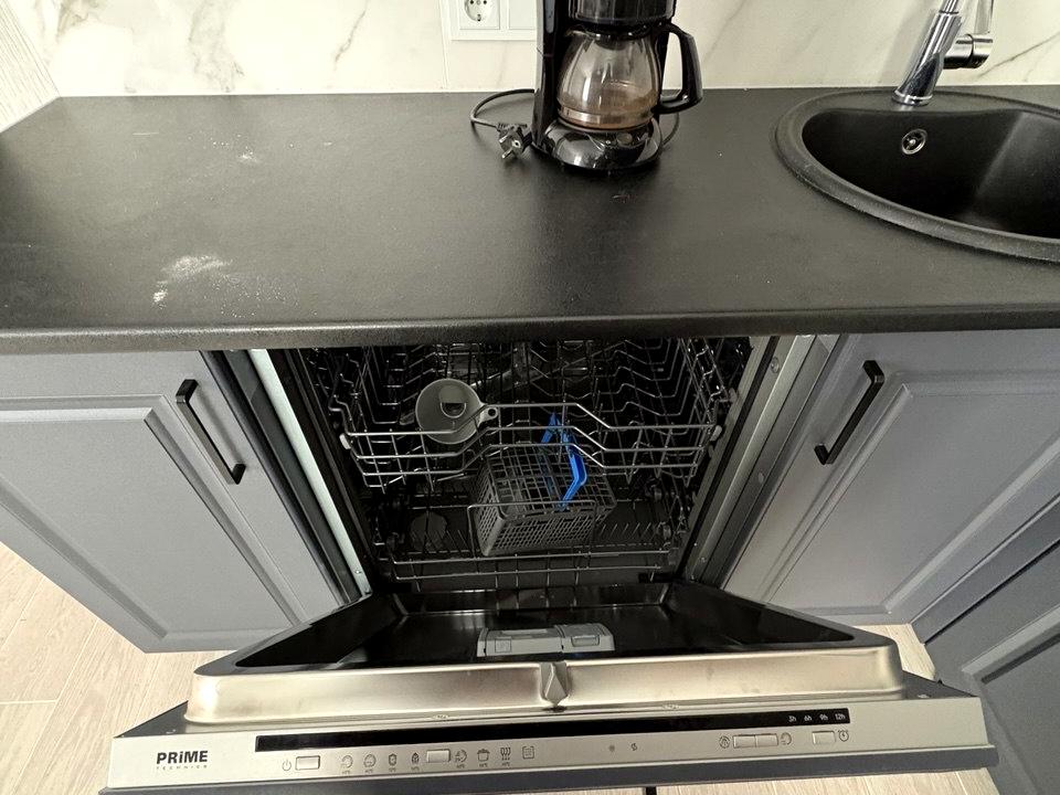 вбудована кухня, варильна поверхня, електрична духова шафа, холодильник, посудомийна машина, кухонний стіл зі стільцями, зручне ліжко, велика шафа-купе, пральна машина, бойлер.