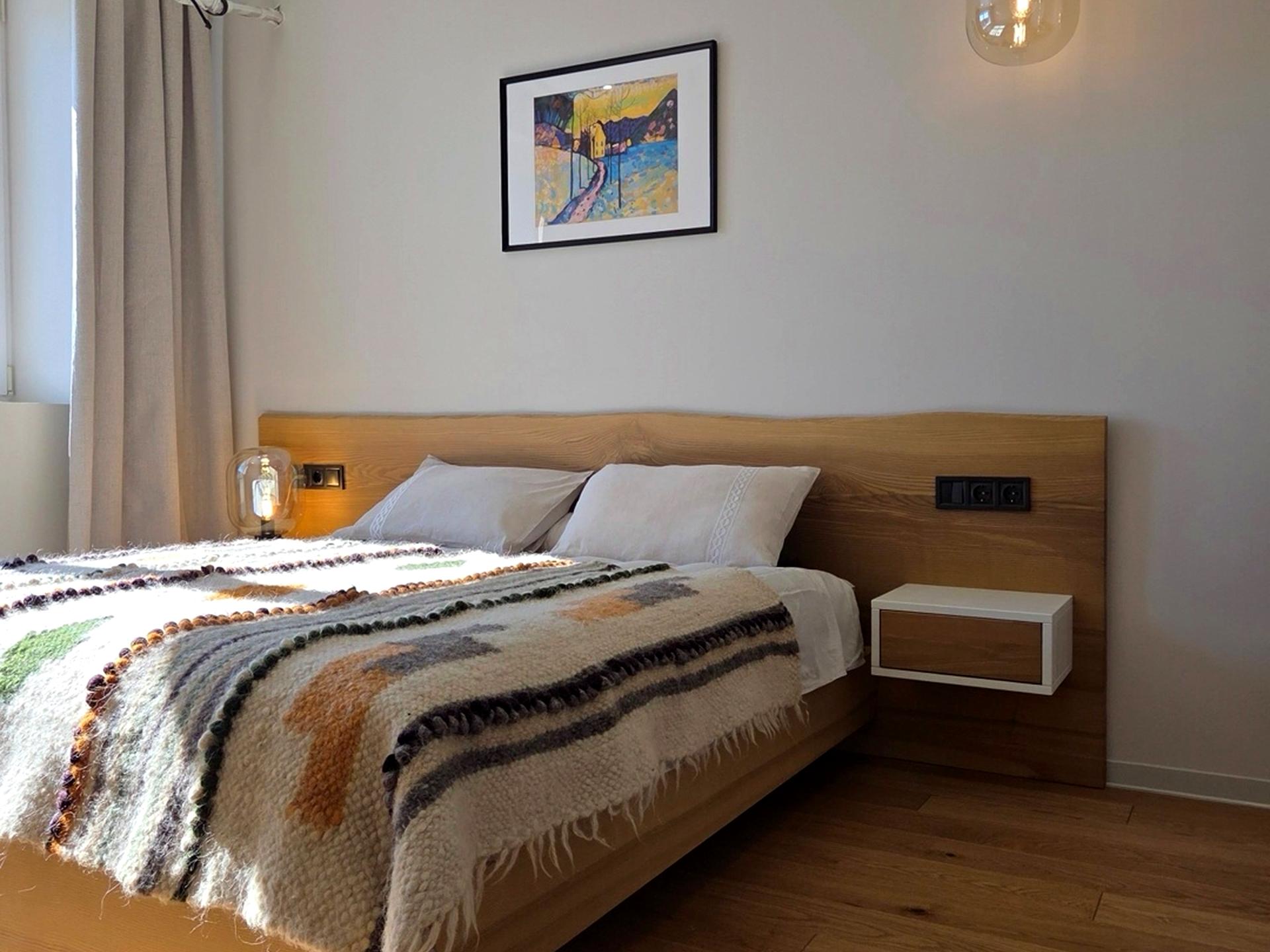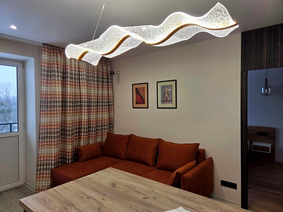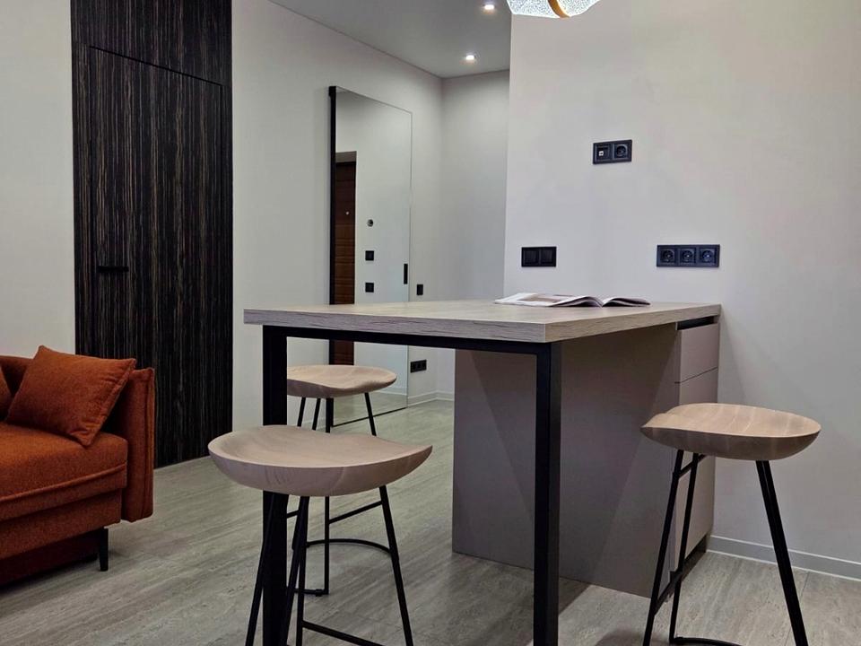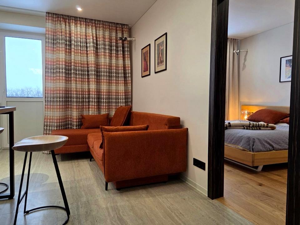 Кухня-вітальня зі зручним диваном, який розкладається та окрема спальня з двоспальним ліжком та робочою зоною. Для зберігання речей мається окрема гардеробна.