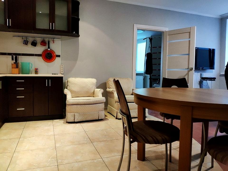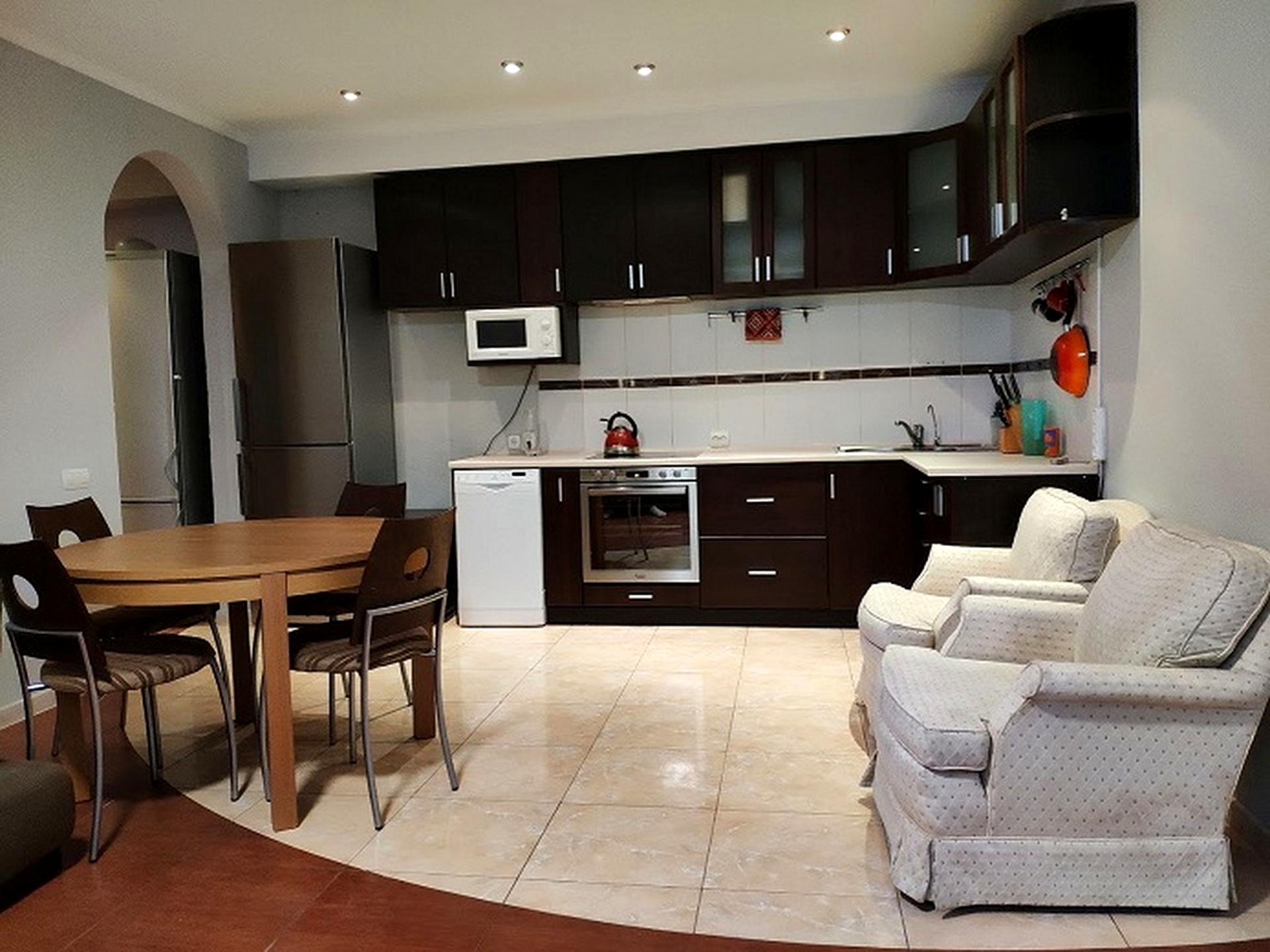 Кухня- вітальня з сучасною технікою ( посудомийна, холодильник, мікрохвильова піч, варильна поверхня, духова шафа, чайник, посуд).