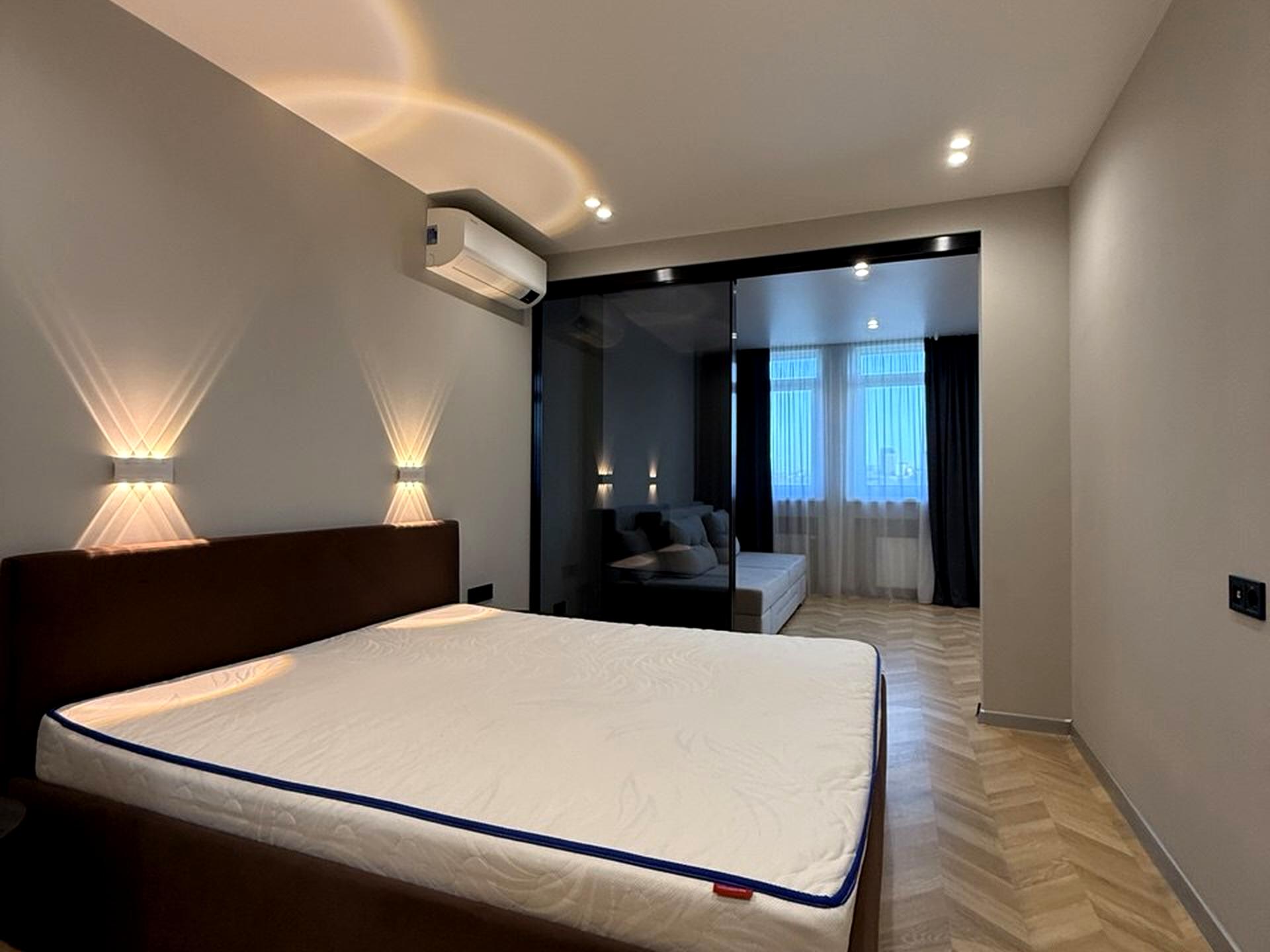 Квартира з сучасним ремонтом, повністю укомплектована меблями та технікою: кондиціонери, посудомийна машина, духова шафа, холодильник, мікрохвильова піч, телевізор. У санвузлі простора душова, підігрів підлоги, бойлер, пральна машина з сушкою та система анти-потоп. Є велика гардеробна кімната.