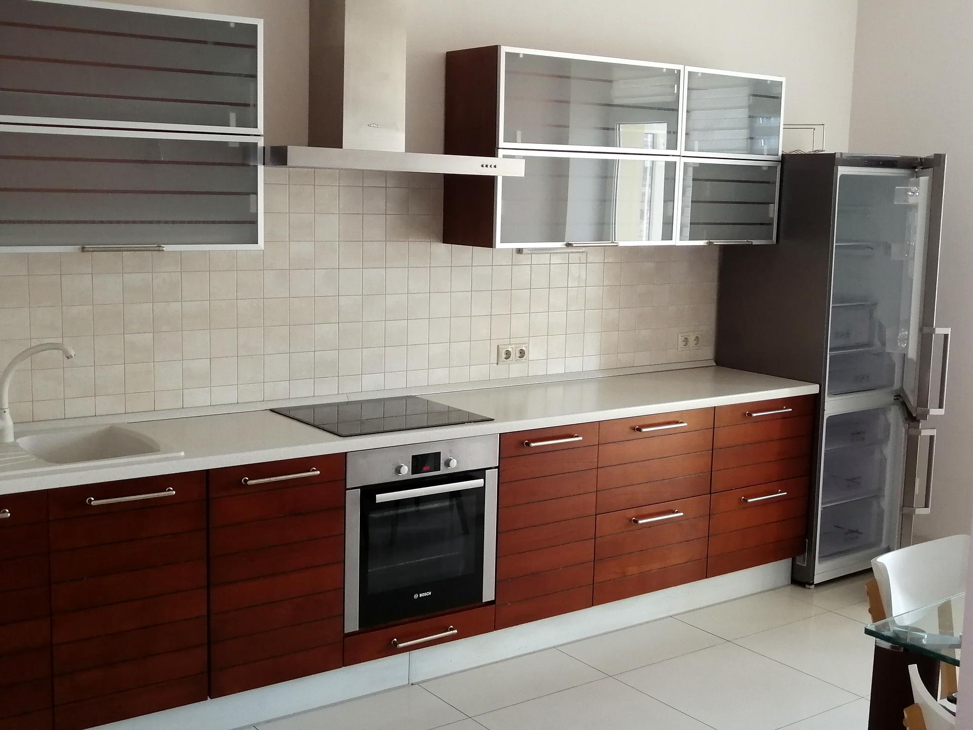 Кухня-їдальня площею 18 кв.м. – обладнана вбудованими меблями із побутовою технікою: варильна поверхня, духова шафа, посудомийна машина – Бош, двокамерний холодильник Самсунг, витяжка.