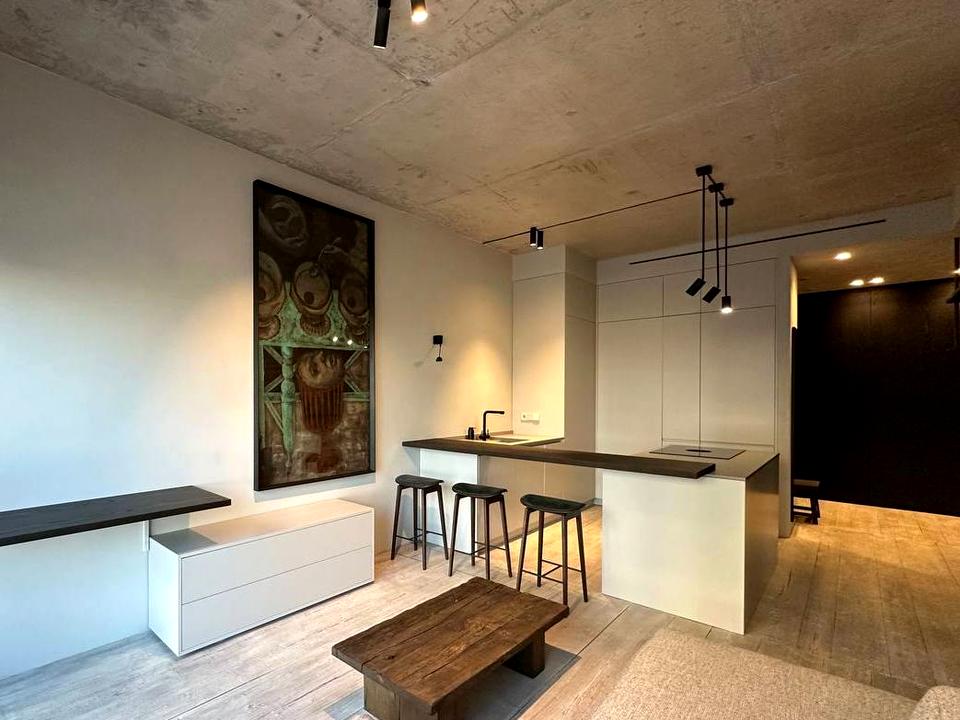 Апартаменти розділені на передпокій, обʼєднану вітальню-кухню, ізольовану спальню з окремою секцією для зберігання речей.