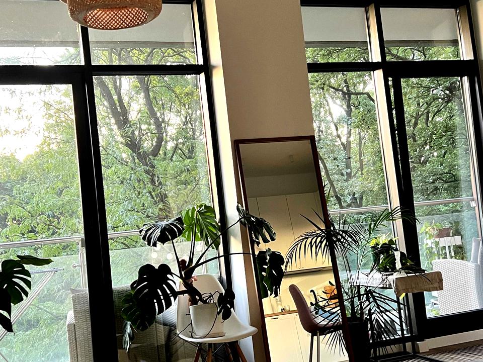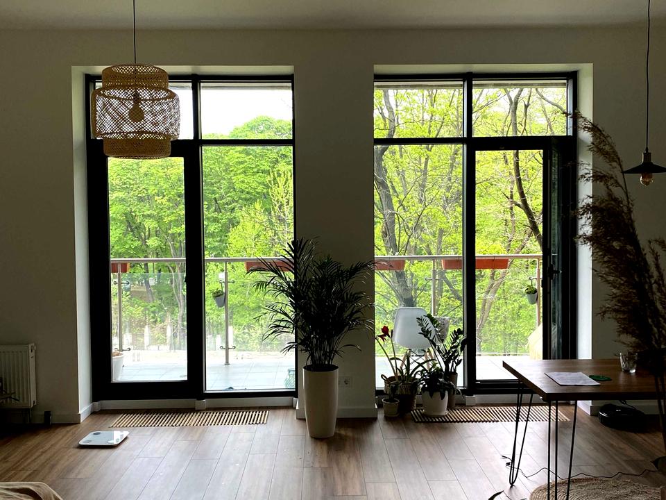 Простора кімната поєднана з кухнею, панорамні вікна із чудовим видом на природу. Мінімалістичний ремонт створює відчуття легкості й затишку. У ванній кімнаті – тепла підлога, а вся квартира дуже тепла навіть у холодну пору року. Вид з вікон на парк. Просторий відкритий балкон з меблями на якому супер затишно відпочивати в теплу пору року.