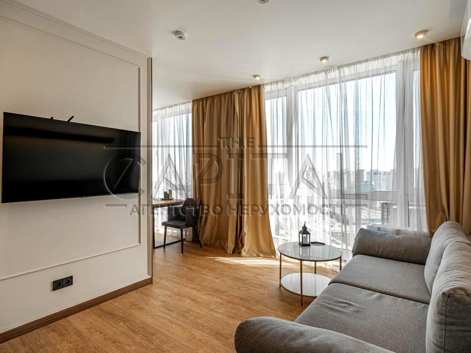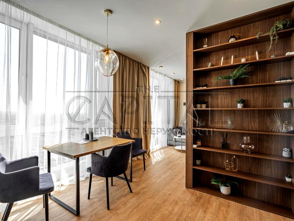 Квартира розміщена на 25 поверсі, з панорамними вікнами з видом на Дніпро.