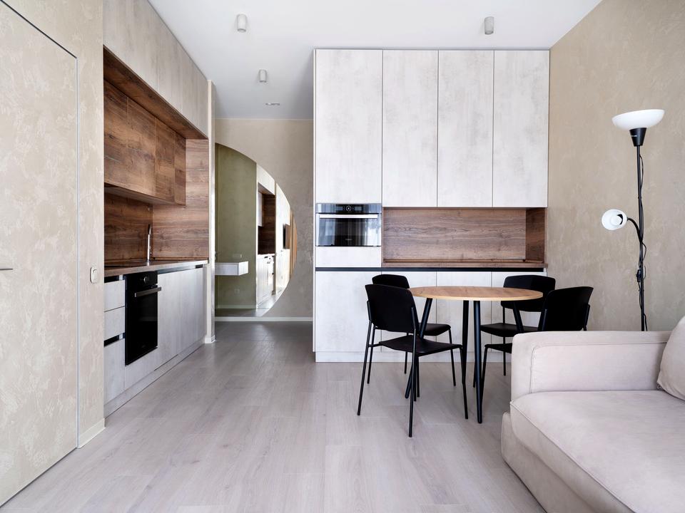 Планування: передпокій з гардеробною, вітальня об'єднана з кухнею та їдальнею, спальня з гардеробом, санвузол.