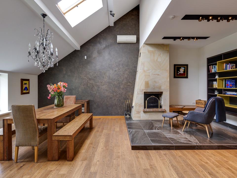 -вітальня з каміном та мансардними вікнами