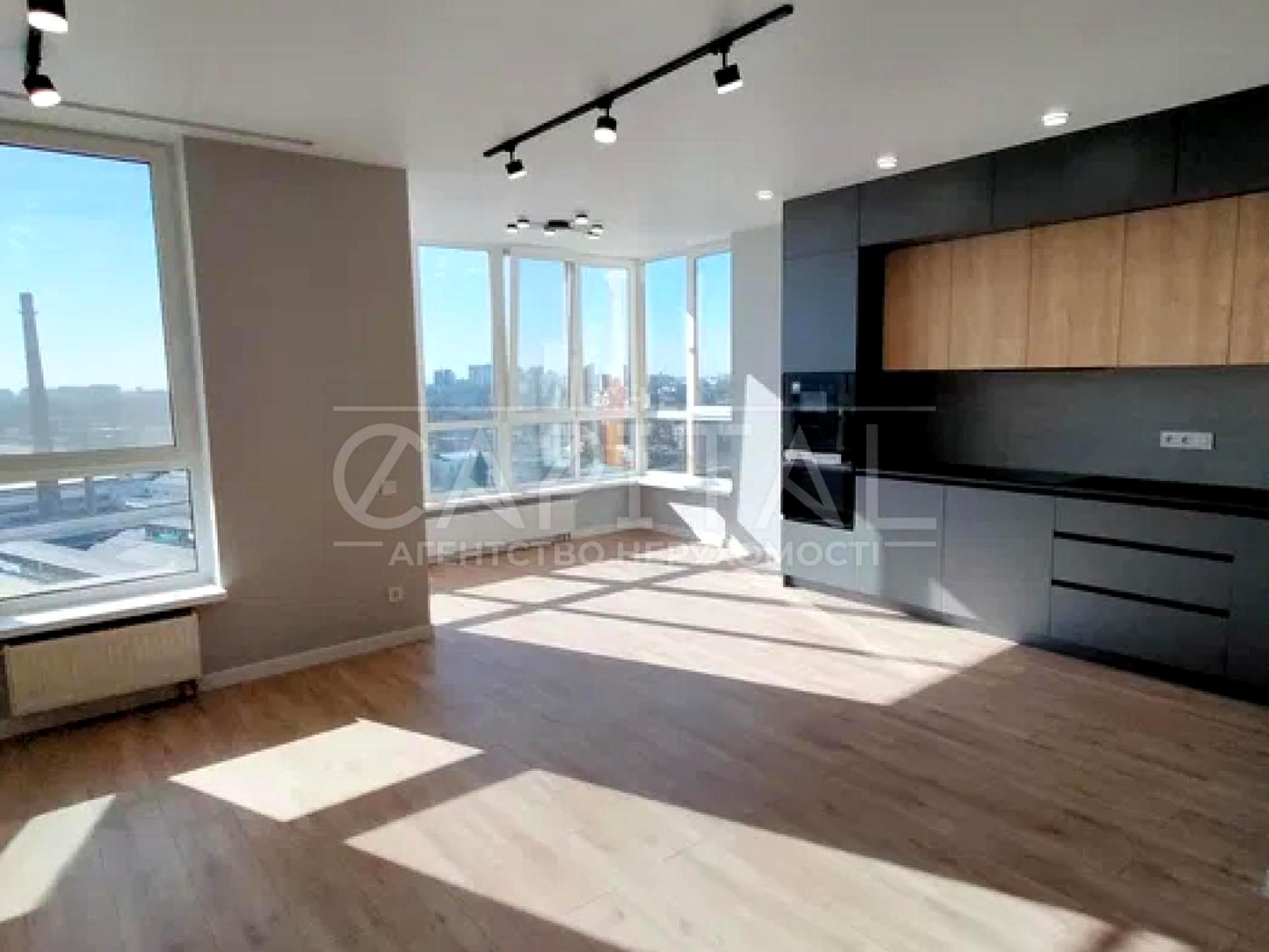 Лоджія об’єднана з кухнею, що створює простору кухню-вітальню з панорамним видом на місто.