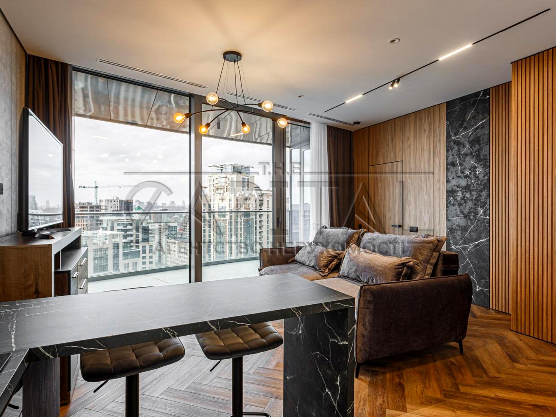 Квартира виконана у світлих, нейтральних тонах, що підкреслює відчуття простору та затишку. Високі стелі та панорамні вікна забезпечують багато природного світла протягом дня