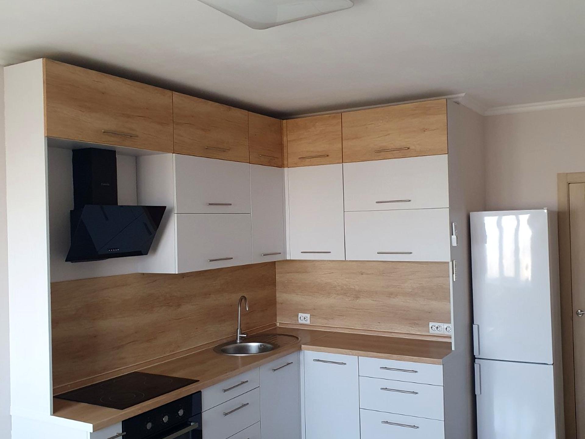Комплектація квартири меблями та технікою: кутова кухня, варильна поверхня, духова шафа, витяжка, холодильник, пральна машина, двоспальне ліжко, диван, шафи, душова кабіна.