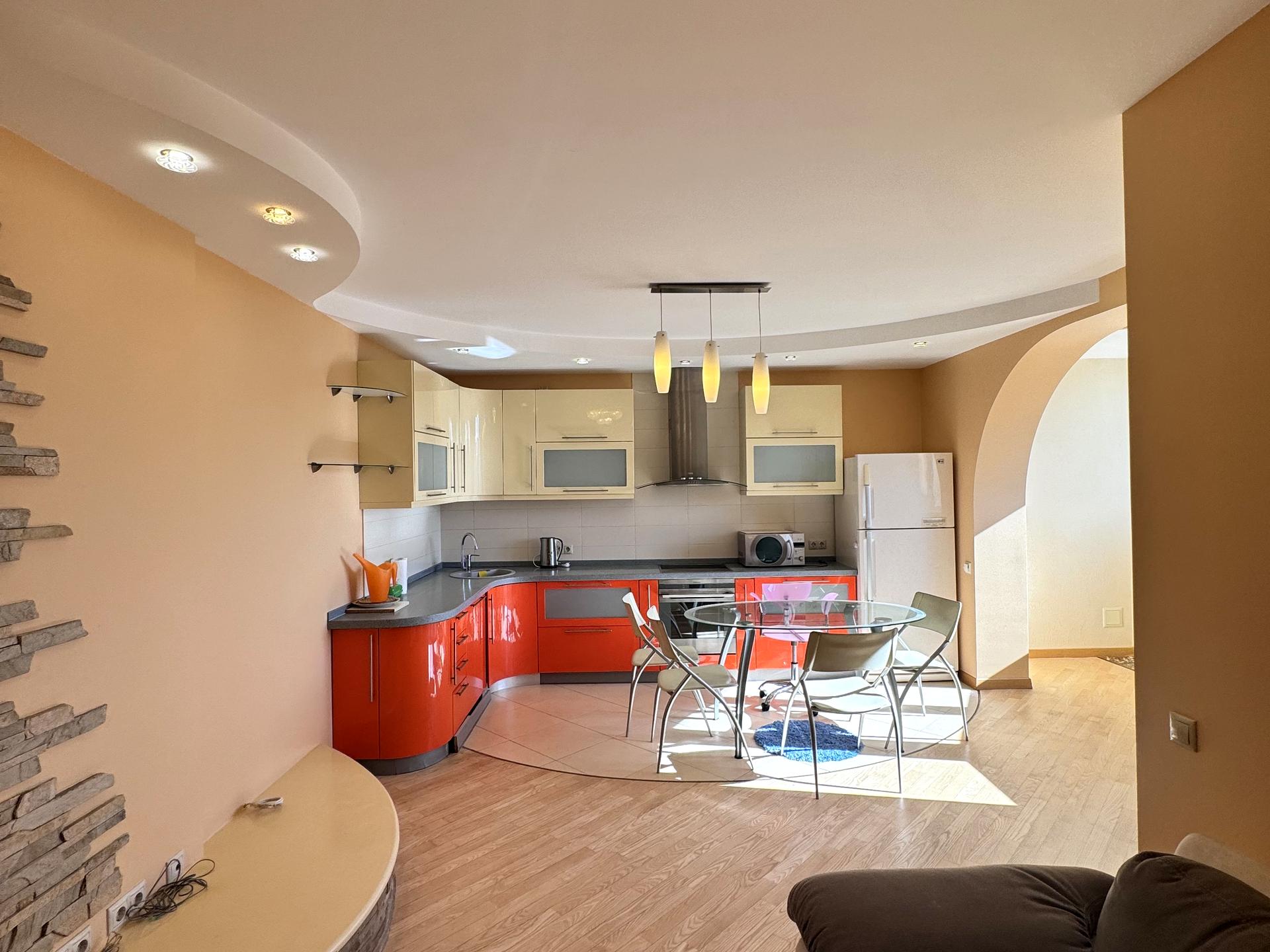 В квартирі велика кухня студія, з вбудованою кухнею, обладнана побутовою технікою Електролюкс, велика посудомийна машина.