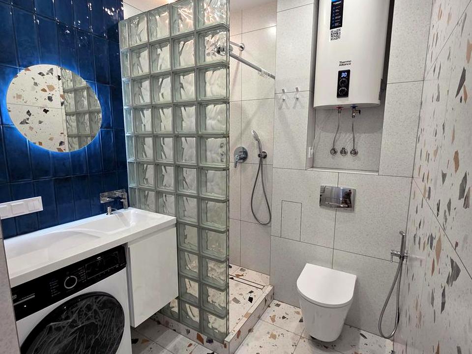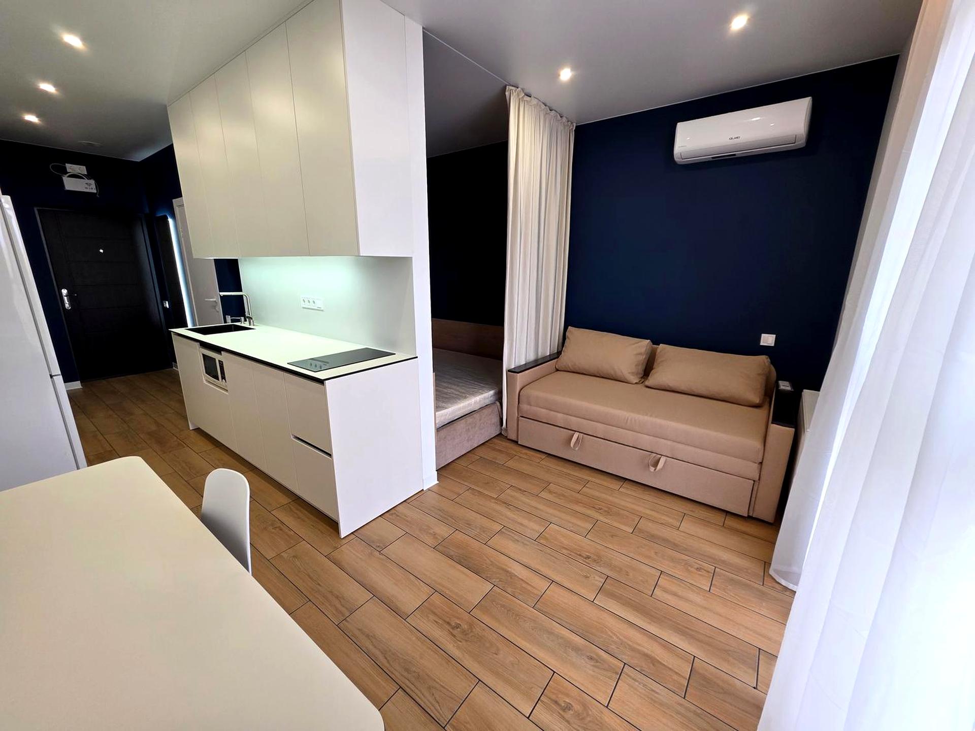 В квартирі 1 кімната, висота стелі 2.7 метра, Технологія будівництва - Блочна, Тип будинку - Спец. проект. Немає газу, кухонна плита електрична. Є балкон. У квартирі є Підігрів підлоги, Кондиціонер, Пральна машина, Сушильна машина, Душова кабіна, Холодильник, Мікрохвильовка. Будинок побудований в 2024 році. Загальний стан квартири - З ремонтом. Безбар'єрність: паркувальні місця для осіб з інвалідністю, ліфт, пристосований до крісла колісного. Гаряча вода - електричний бойлер. Кількість санвузлів: 1. Інтернет оптоволоконний. Працює без світла - вода, опалення, інтернет. Тип кухні - кухня-студія. Кількість спален: 1. Немає підземного паркінгу, доступного як укриття. Інфраструктура території: дитячий майданчик, спортивний майданчик. Комісія за послуги 50 %