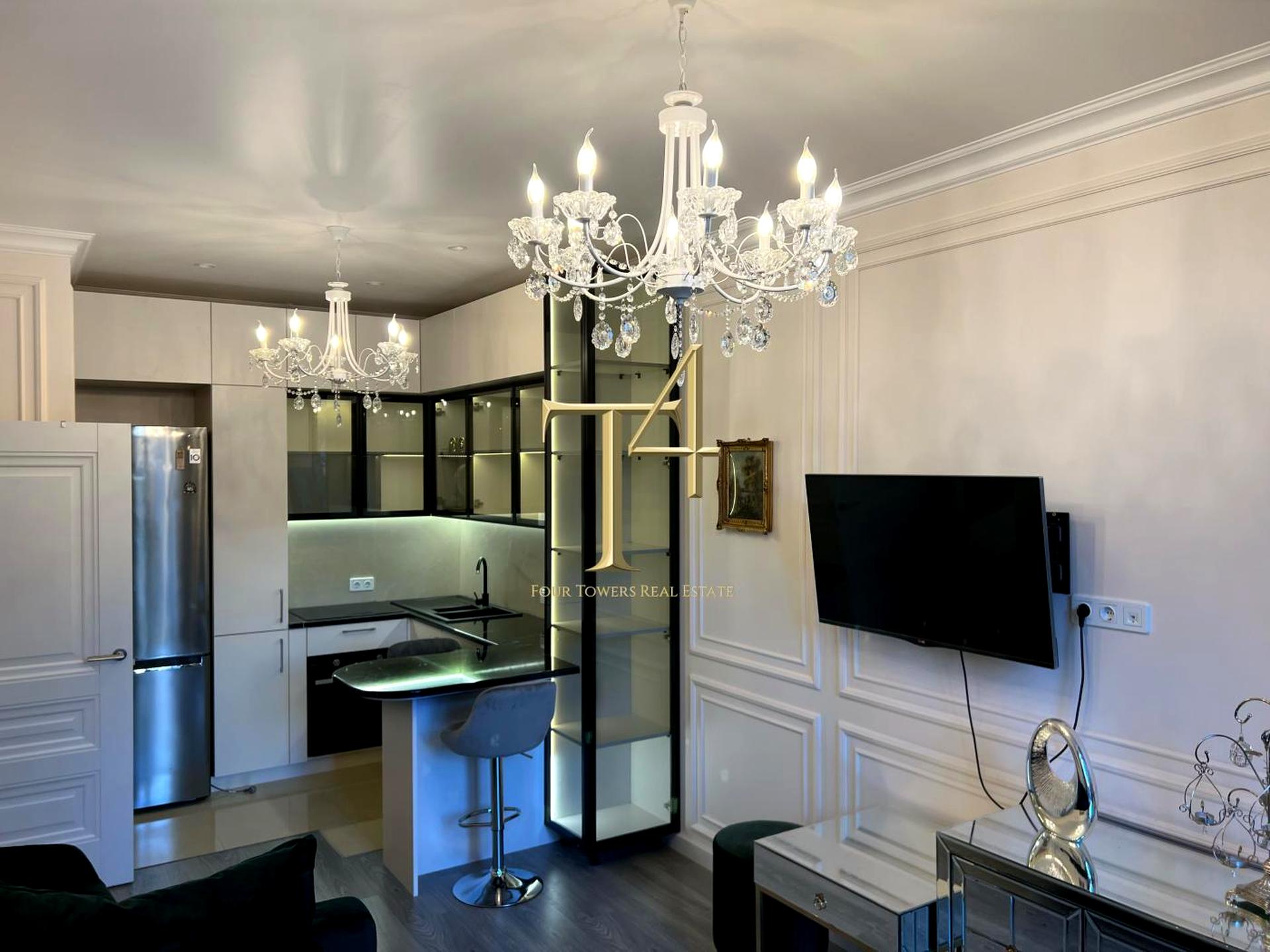 Квартира виконана у стилі неокласика з авторським дизайном та ексклюзивним дорогим ремонтом. Усі деталі інтер’єру продумані до дрібниць: мармурові підвіконня, дизайнерські меблі з Італії, унікальний декор та витвори мистецтва створюють атмосферу справжнього люксу.