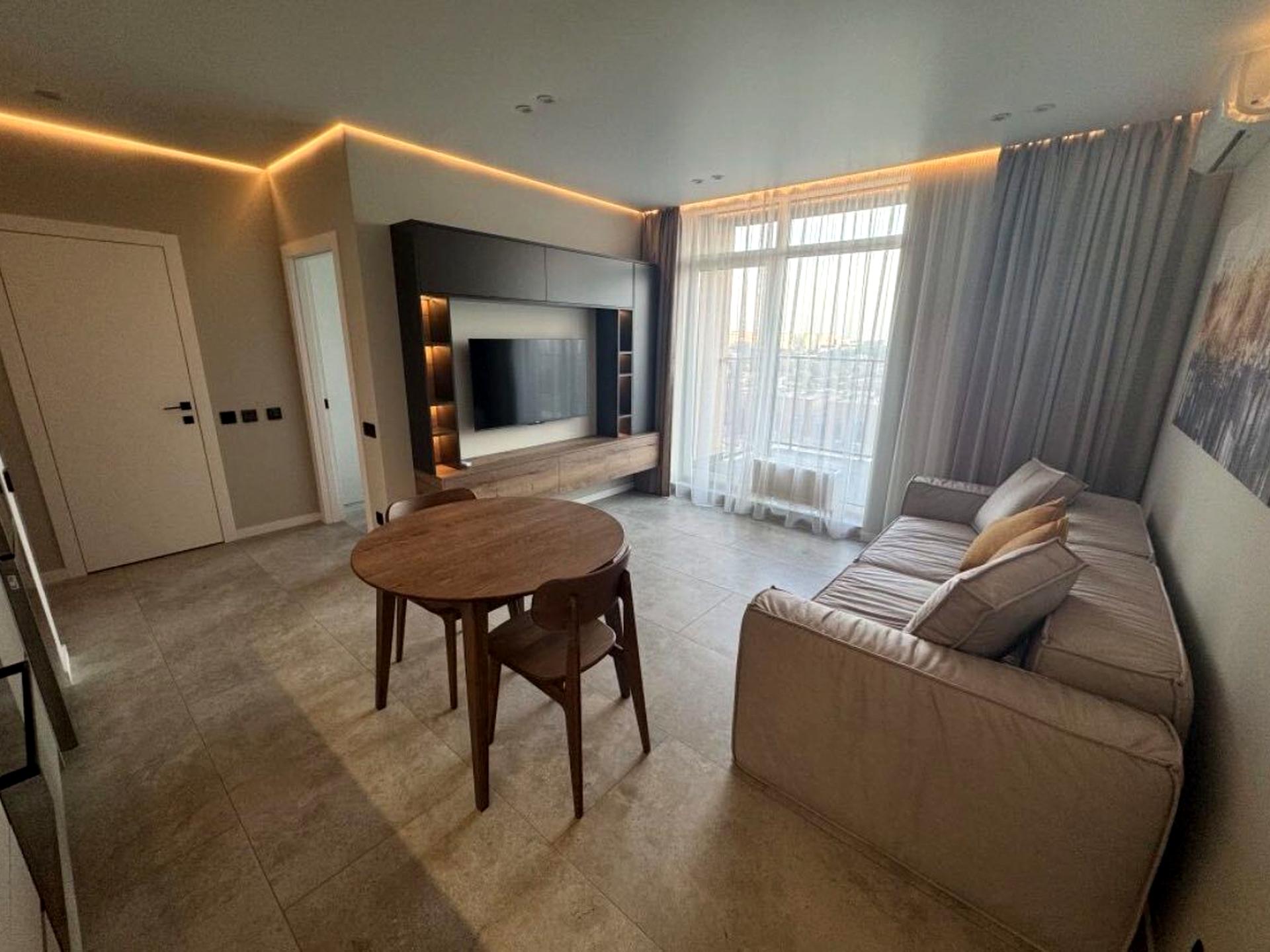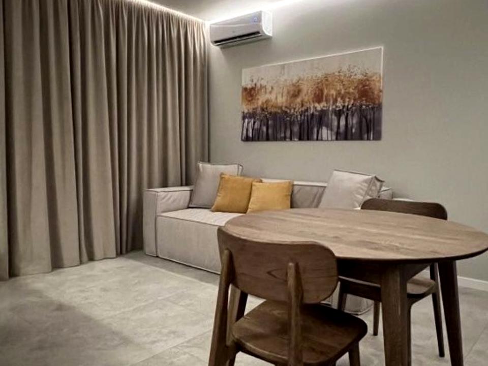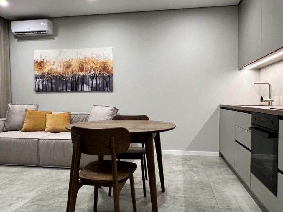 В квартирі 1 кімната, висота стелі 2.8 метра, Технологія будівництва - Блочна, Тип будинку - Спец. проект. Немає газу, кухонна плита електрична. У квартирі є Телевізор, Праска, Підігрів підлоги, Кондиціонер, Пральна машина, Душова кабіна, Холодильник, Мікрохвильовка, Посудомийна машина. Будинок побудований в 2021 році. Загальний стан квартири - З ремонтом. Гаряча вода - електричний бойлер. Кількість санвузлів: 1. Інтернет оптоволоконний. Працює без світла - вода, опалення, інтернет. Тип кухні - кухня-студія. Кількість спален: 1. Інфраструктура території: дитячий майданчик, спортивний майданчик. Комісія за послуги 50 %