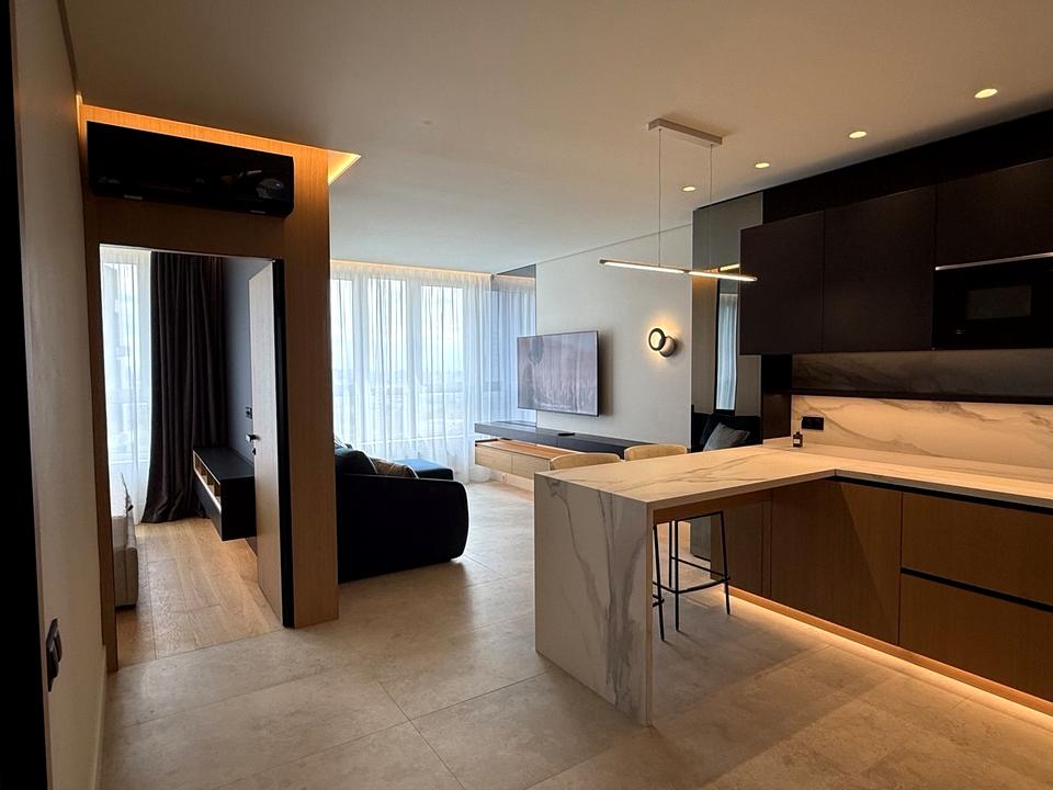 В квартирі 2 кімнати, висота стелі 2.7 метра, Технологія будівництва - Цегляна, Тип будинку - Спец. проект. Немає газу, кухонна плита електрична. Немає балкона. У квартирі є Телевізор, Кондиціонер, Пральна машина, Сушильна машина, Душова кабіна, Холодильник, Мікрохвильовка, Посудомийна машина. Будинок побудований в 2022 році. Загальний стан квартири - З ремонтом. Гаряча вода - електричний бойлер. Кількість санвузлів: 1. Інтернет дротовий (кабельний). Працює без світла - вода, опалення, інтернет, ліфт. Тип кухні - кухня-студія. Кількість спален: 1. Без комісії