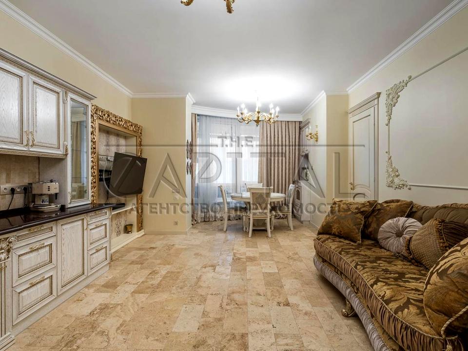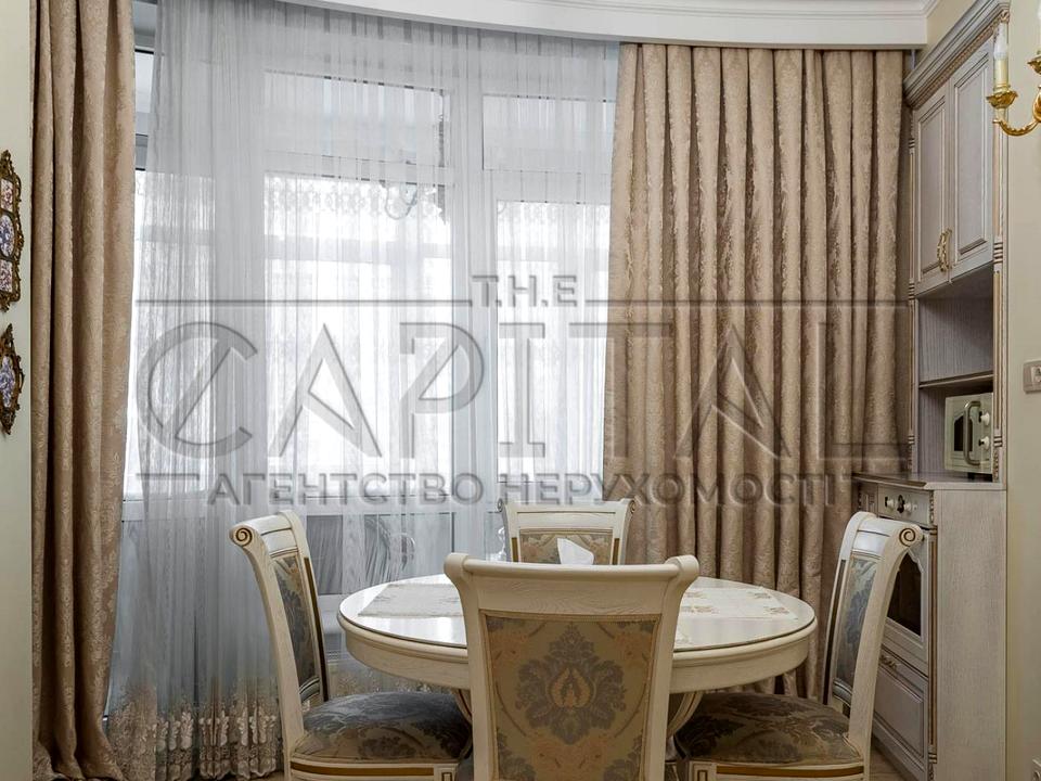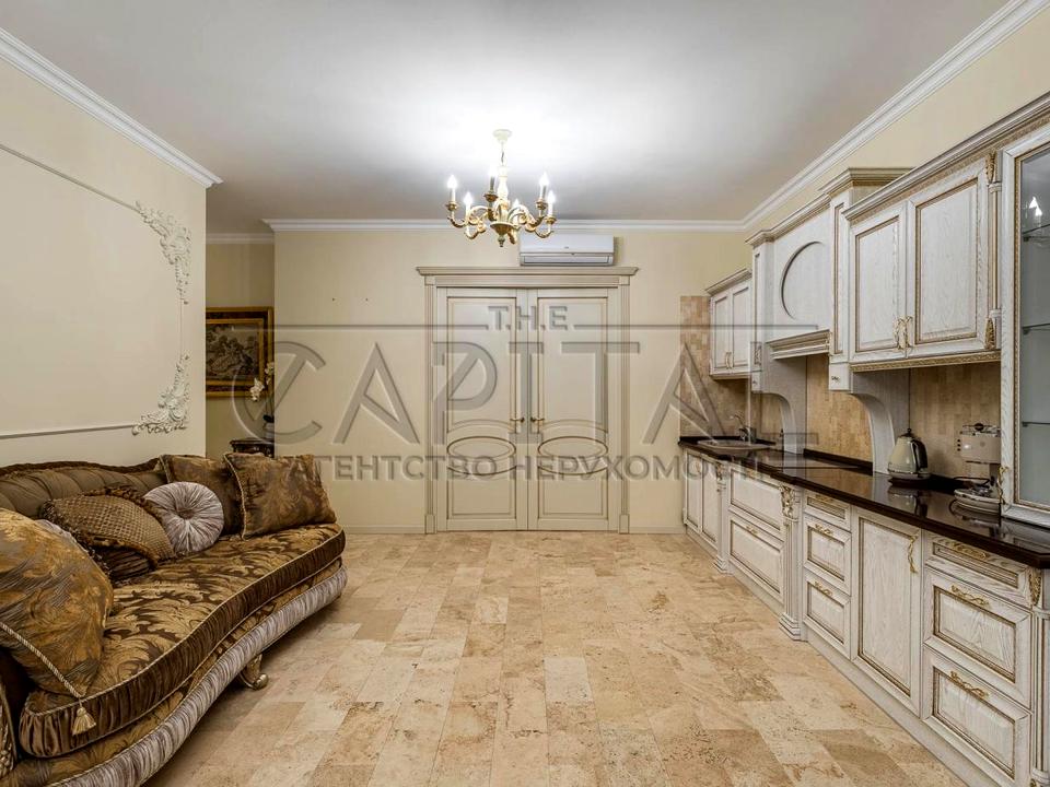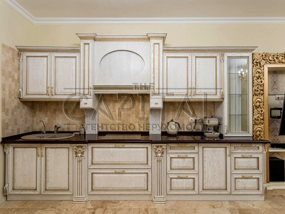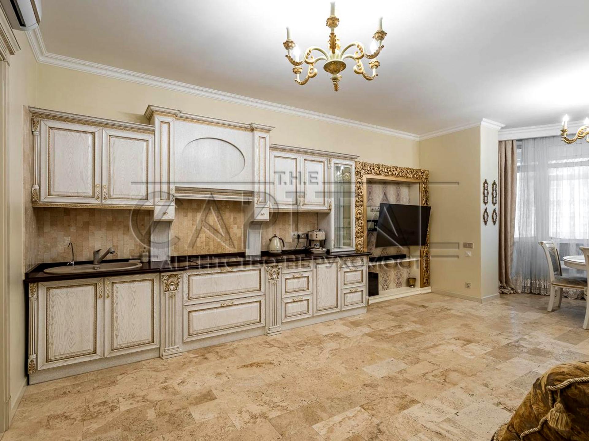 Інтер’єр виконаний у класичному стилі з елементами бароко: використано якісні матеріали, італійські меблі та сантехніку. У квартирі встановлено теплі підлоги, покриття — травертин і паркет.