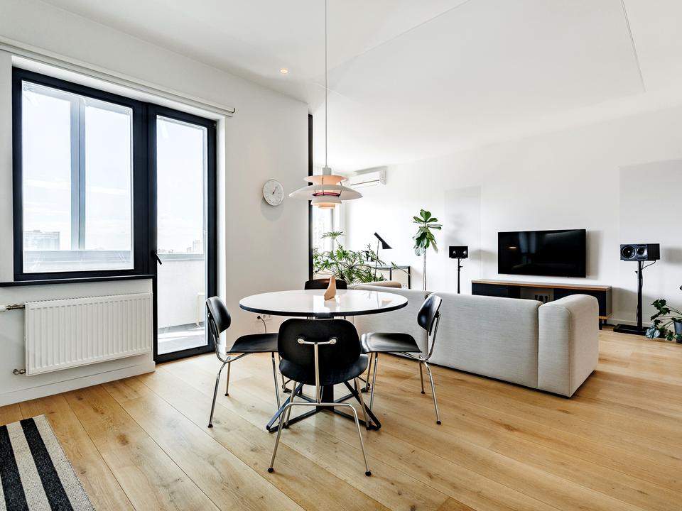 - обідня зона: круглий стіл Artek, стільці Vitra та дизайнерський світильник Louis Poulsen