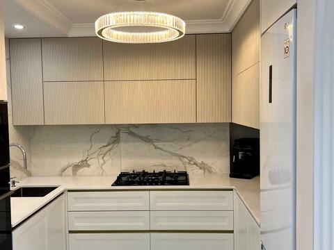 Кухня-студия, теплый пол (Woks), встроенная сантехника Hansgrohe, сигнализация и датчики AJAX, видеонаблюдение, электрика Schneider Electric, кухня с фурнитурой Blum и кварцевыми столешницами.