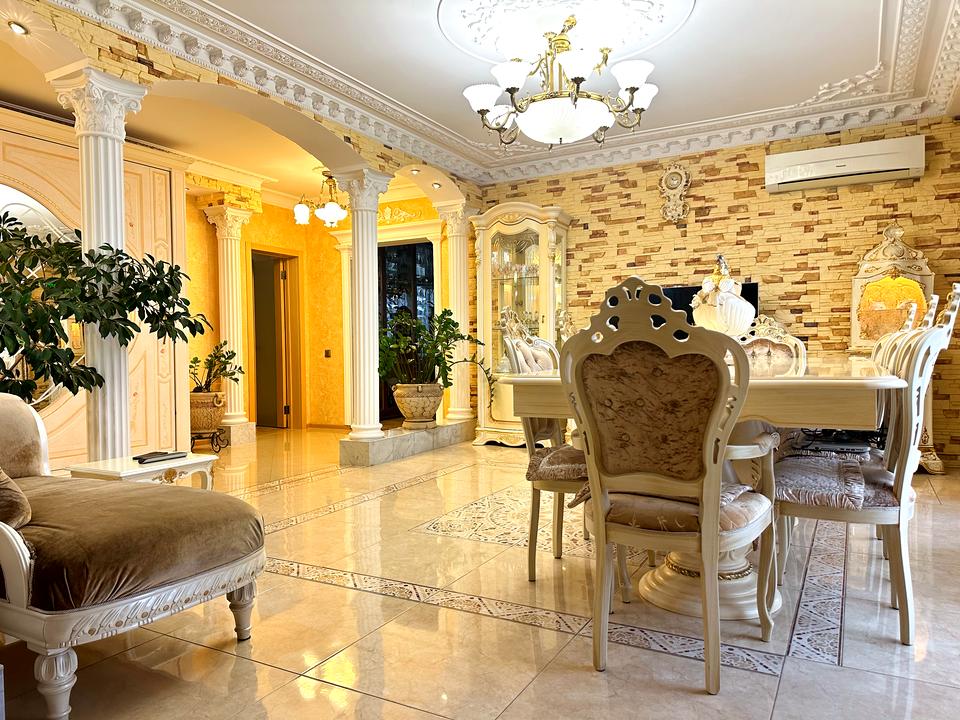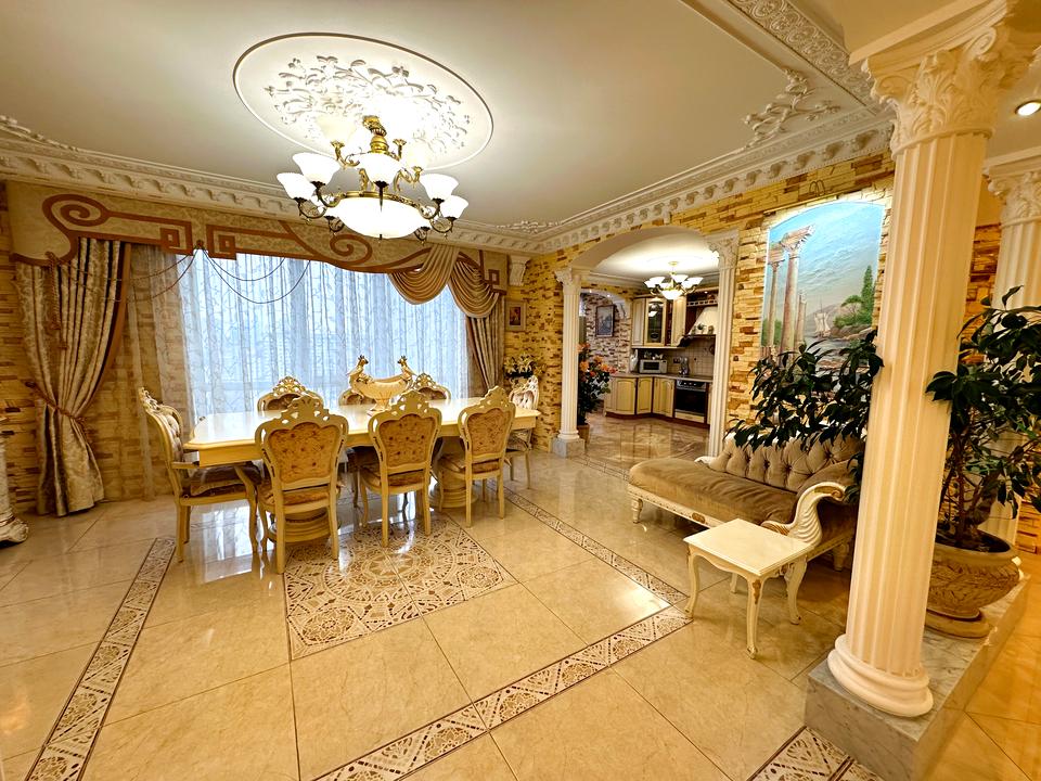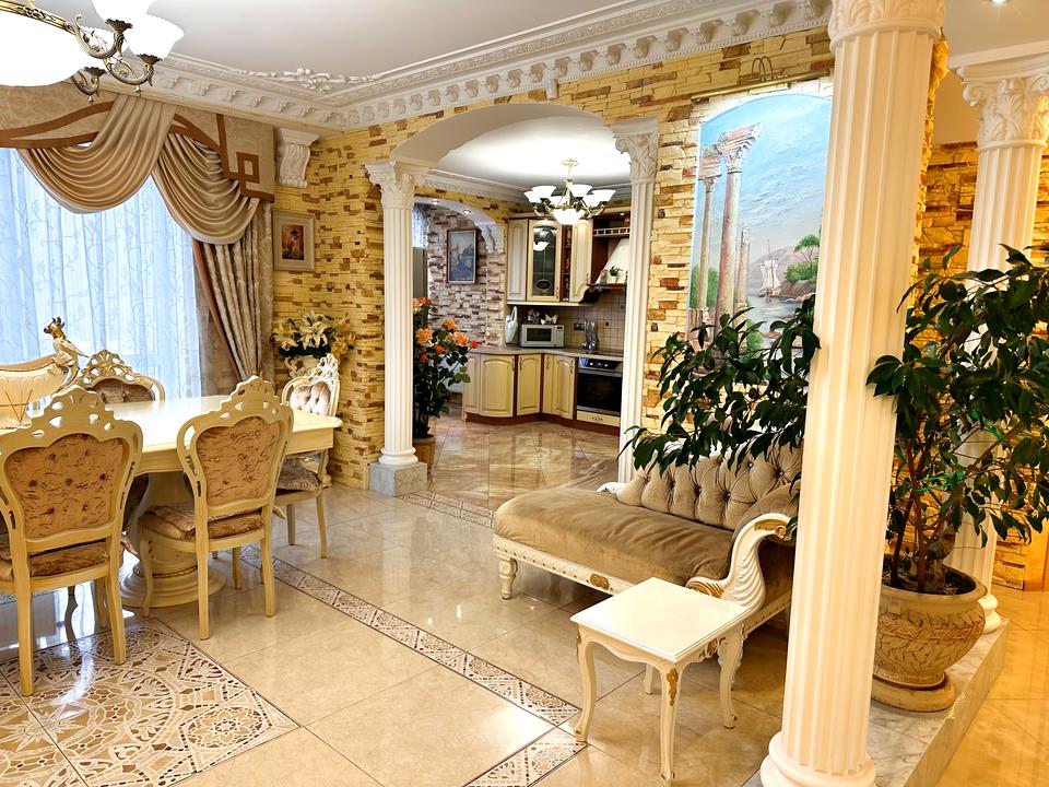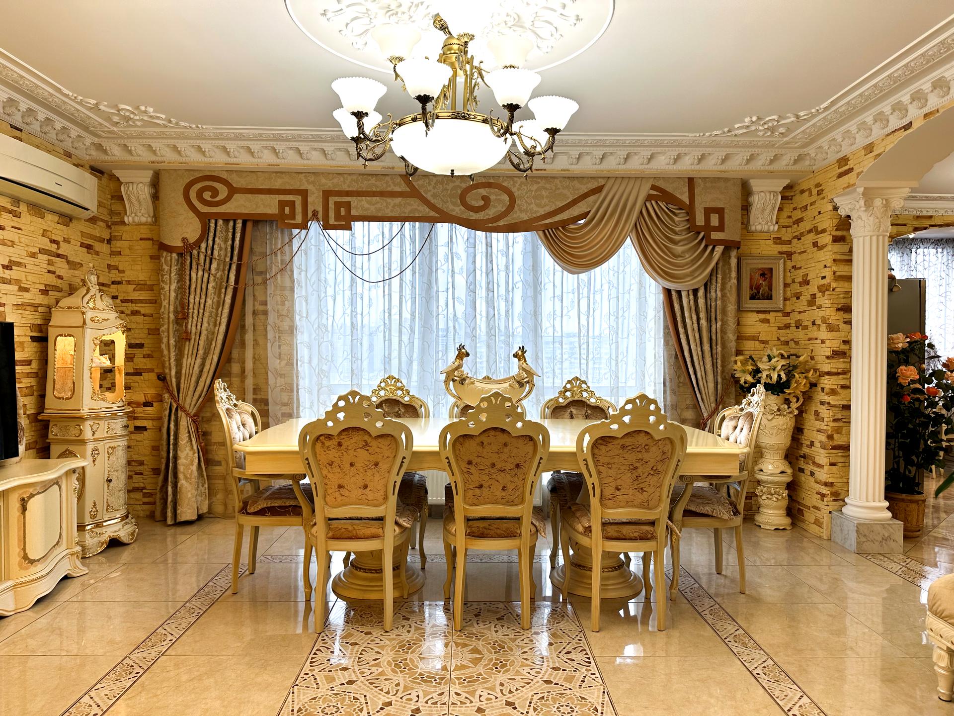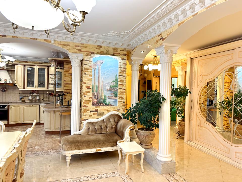 Квартира виконана в античному стилі, що поєднує класичну елегантність з сучасними зручностями. Просторі кімнати, розкішні деталі та високоякісні матеріали.