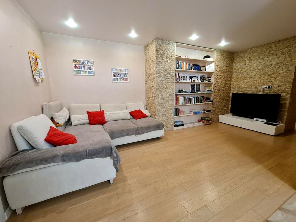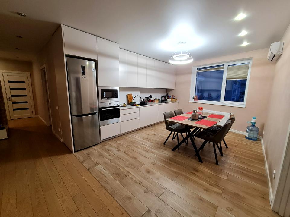 The apartment consists of three isolated rooms, a large kitchen - living room, a dressing room and two bathrooms, one with a bathtub, the other with a shower cabin.