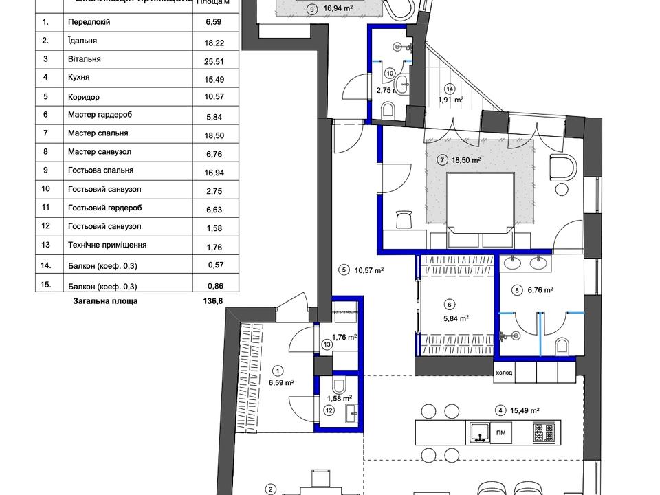 Планування: велика кухня-вітальня з виходом на фасадний балкон, 2 окремі спальні кімнати, 3 санвузли, 2 гардеробні, хол. 2 балкона, з одного — краєвид на бульварну частину вул. Антоновича та парк Шевченка.