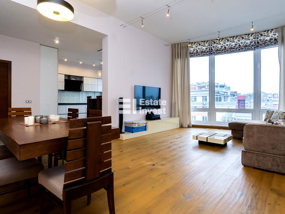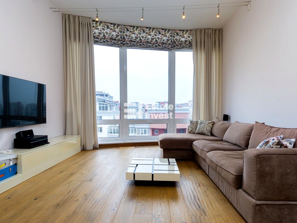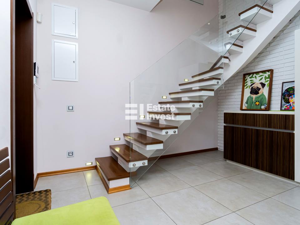 На першому рівні, з холу вихід у простору світлу вітальню з великим сімейним столом, кухня-студія із сучасною побутовою технікою, санвузол. На другий рівень ведуть витончені сходи з натурального дерева, тут дитяча мебльована дитяча кімната з двома дитячими ліжками з великим гардеробом та виходом на відкриту террасу площею 107 м2, спальня з гардеробом, санвузол, кімната з каміном та домашнім кінотеатром також має вихід Високі стелі, панорамні окна з видом на місто, у квартирі світло, сонячно та тепло зимою. Авторський дизайнерський проект, поєднання кольорів, фактури матеріалів, якісна меблі, сантехніка, побутова техніка найкращих виробників забезпечують комфорт. У всіх кімнатах підлога з паркету.